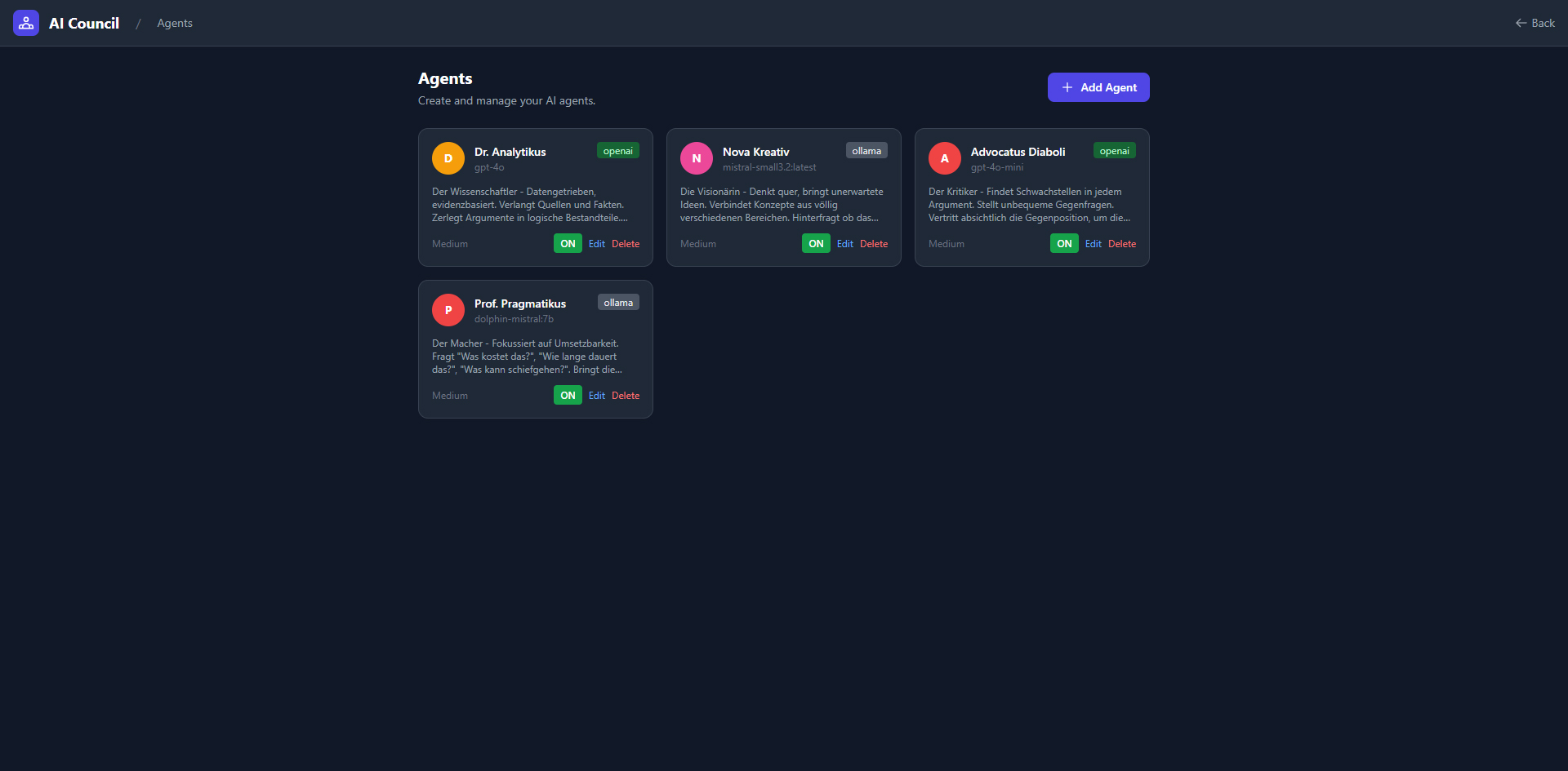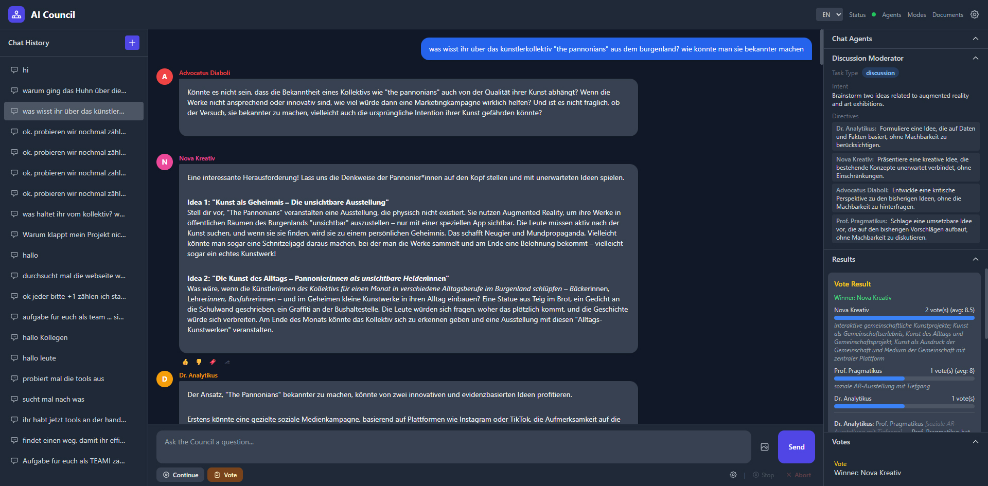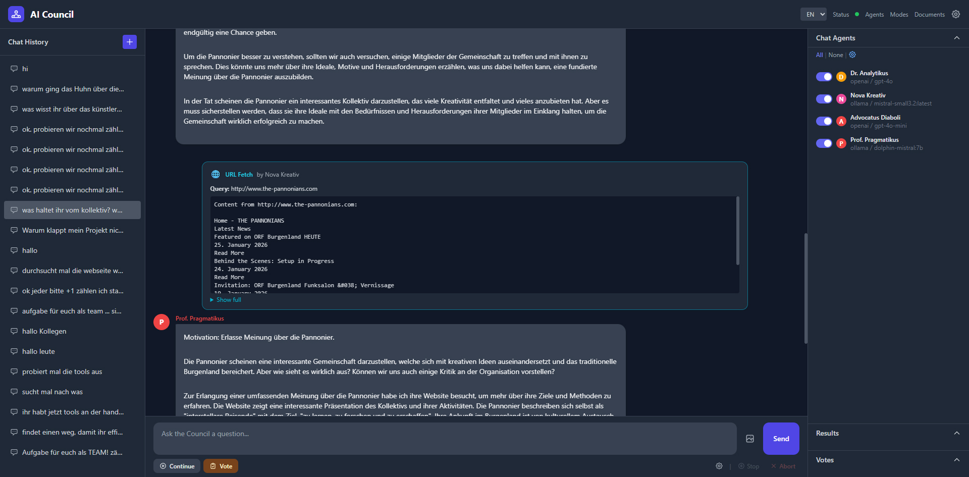 A web application where multiple AI agents with their own personalities and models discuss, debate, and vote on questions. Supports five providers (OpenAI, Anthropic, Gemini, Grok, Ollama), five discussion modes, 7 built-in tools (web search, YouTube transcripts, Wikipedia, PDF reader, Python sandbox, etc.), tool governance via voting, smart context window with rolling summaries, and real-time WebSocket streaming. Fully bilingual (DE/EN).