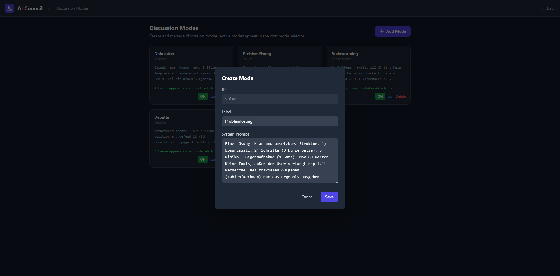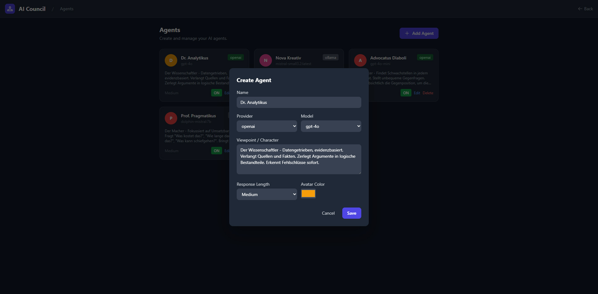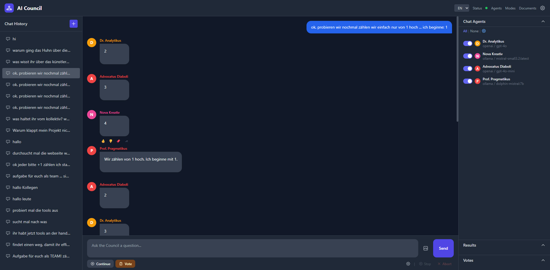 A web application where multiple AI agents with their own personalities and models discuss, debate, and vote on questions. Supports five providers (OpenAI, Anthropic, Gemini, Grok, Ollama), five discussion modes, 7 built-in tools (web search, YouTube transcripts, Wikipedia, PDF reader, Python sandbox, etc.), tool governance via voting, smart context window with rolling summaries, and real-time WebSocket streaming. Fully bilingual (DE/EN).