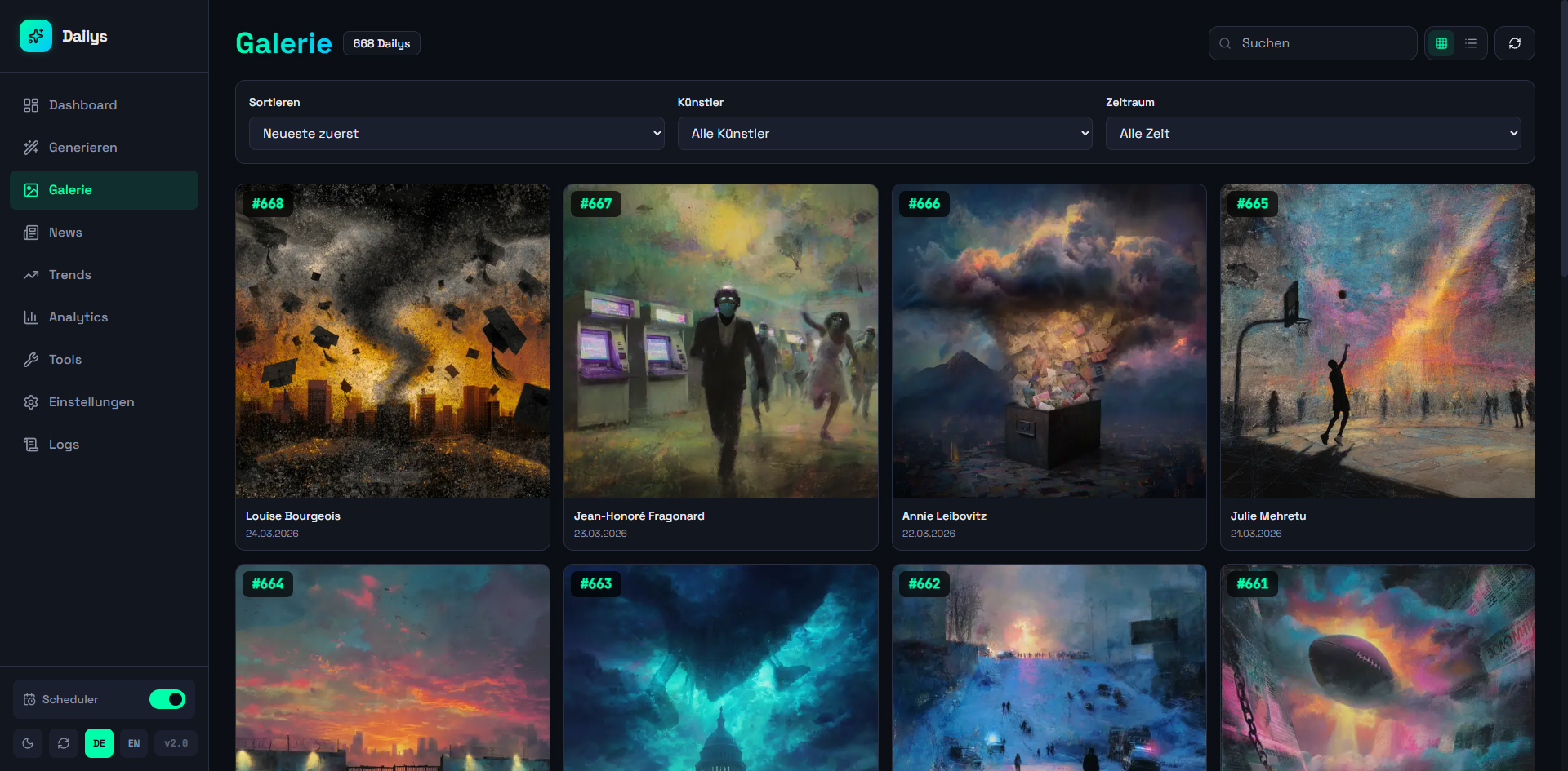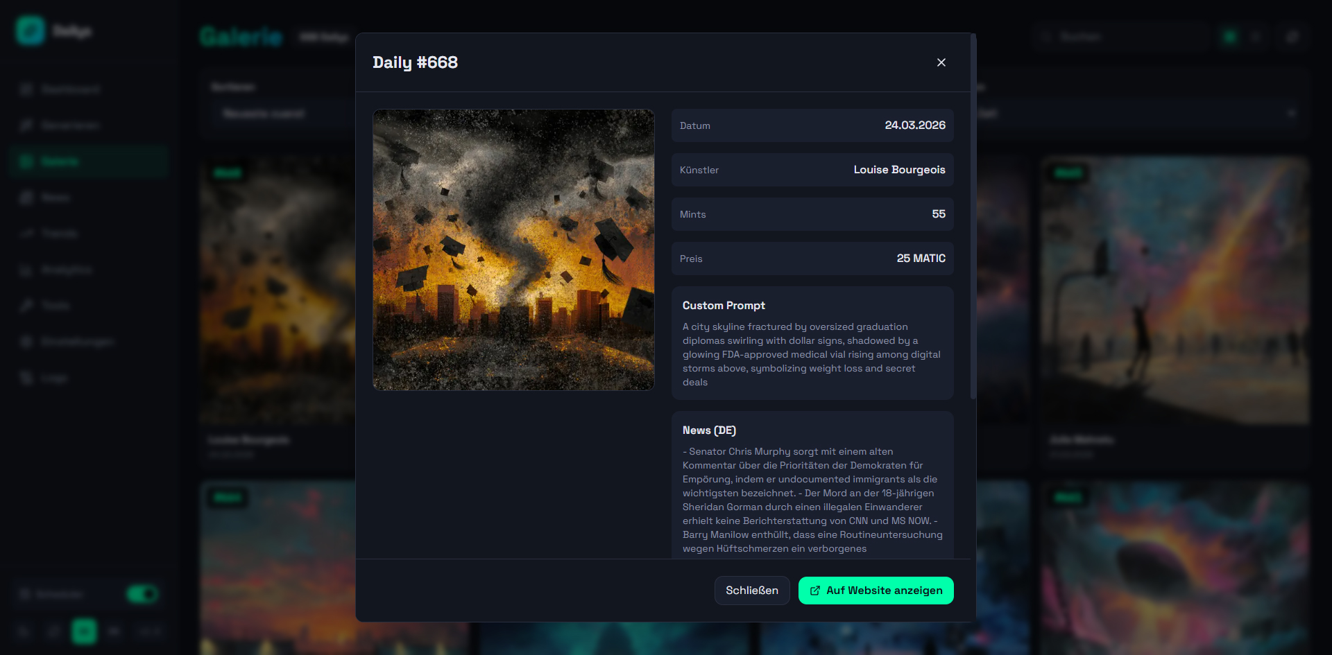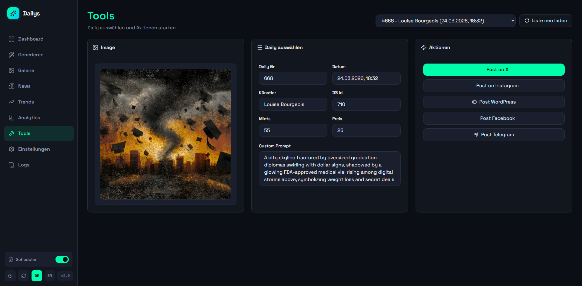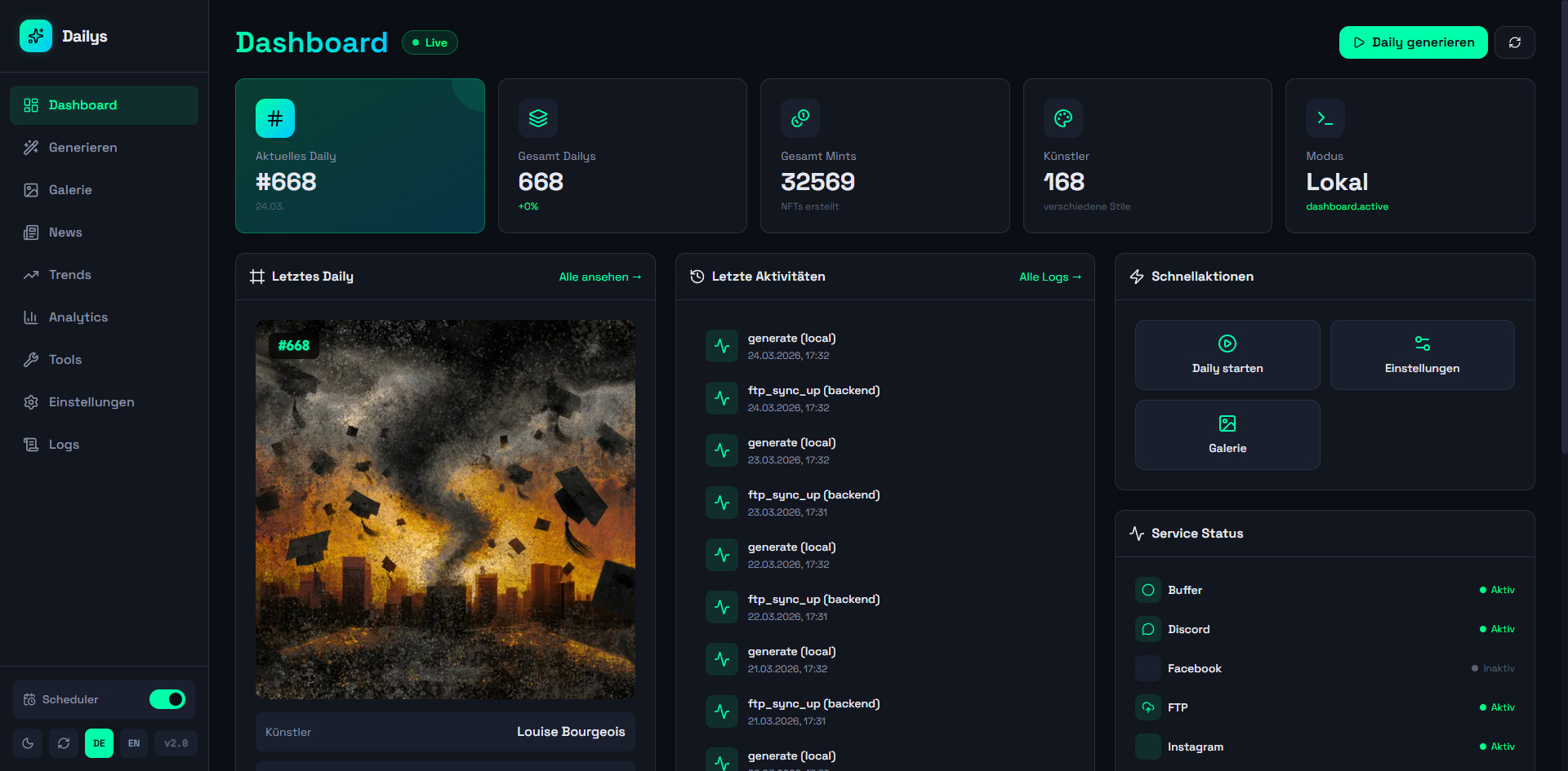 A web dashboard for automated generation and management of Dailys NFTs. Aggregates news from 12+ RSS sources and Google Trends, generates AI prompts (OpenAI), creates images via Midjourney/Discord, and automatically publishes to WordPress, Twitter, Instagram, and Facebook (via Buffer API). Controllable via web UI and Telegram bot with scheduler for daily automatic generation, 140+ artist styles, and multi-site support.