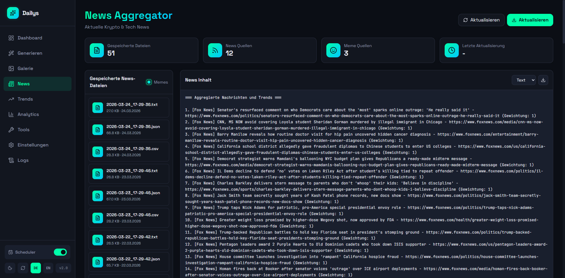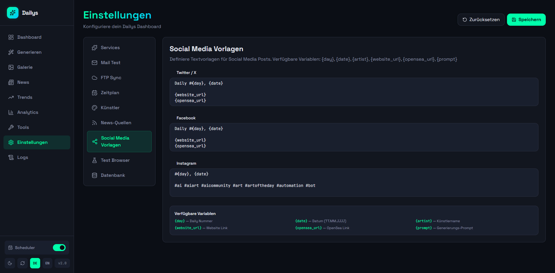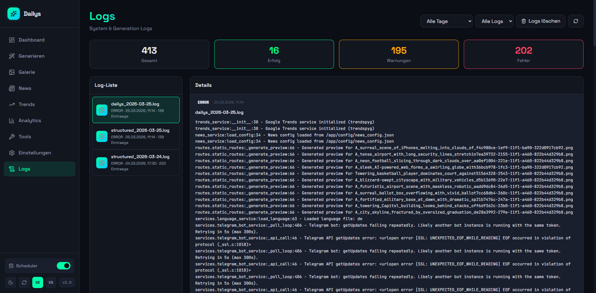 A web dashboard for automated generation and management of Dailys NFTs. Aggregates news from 12+ RSS sources and Google Trends, generates AI prompts (OpenAI), creates images via Midjourney/Discord, and automatically publishes to WordPress, Twitter, Instagram, and Facebook (via Buffer API). Controllable via web UI and Telegram bot with scheduler for daily automatic generation, 140+ artist styles, and multi-site support.