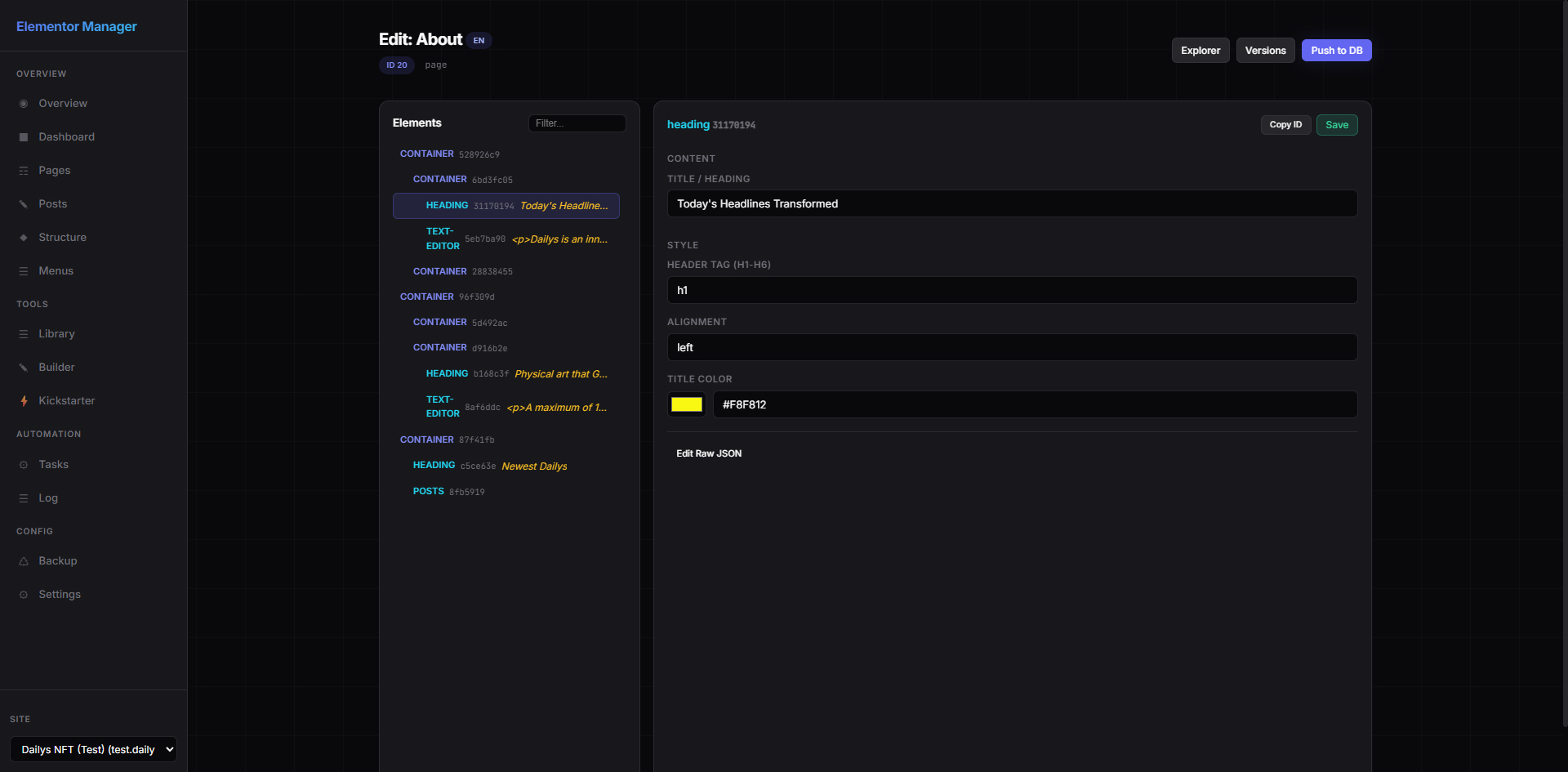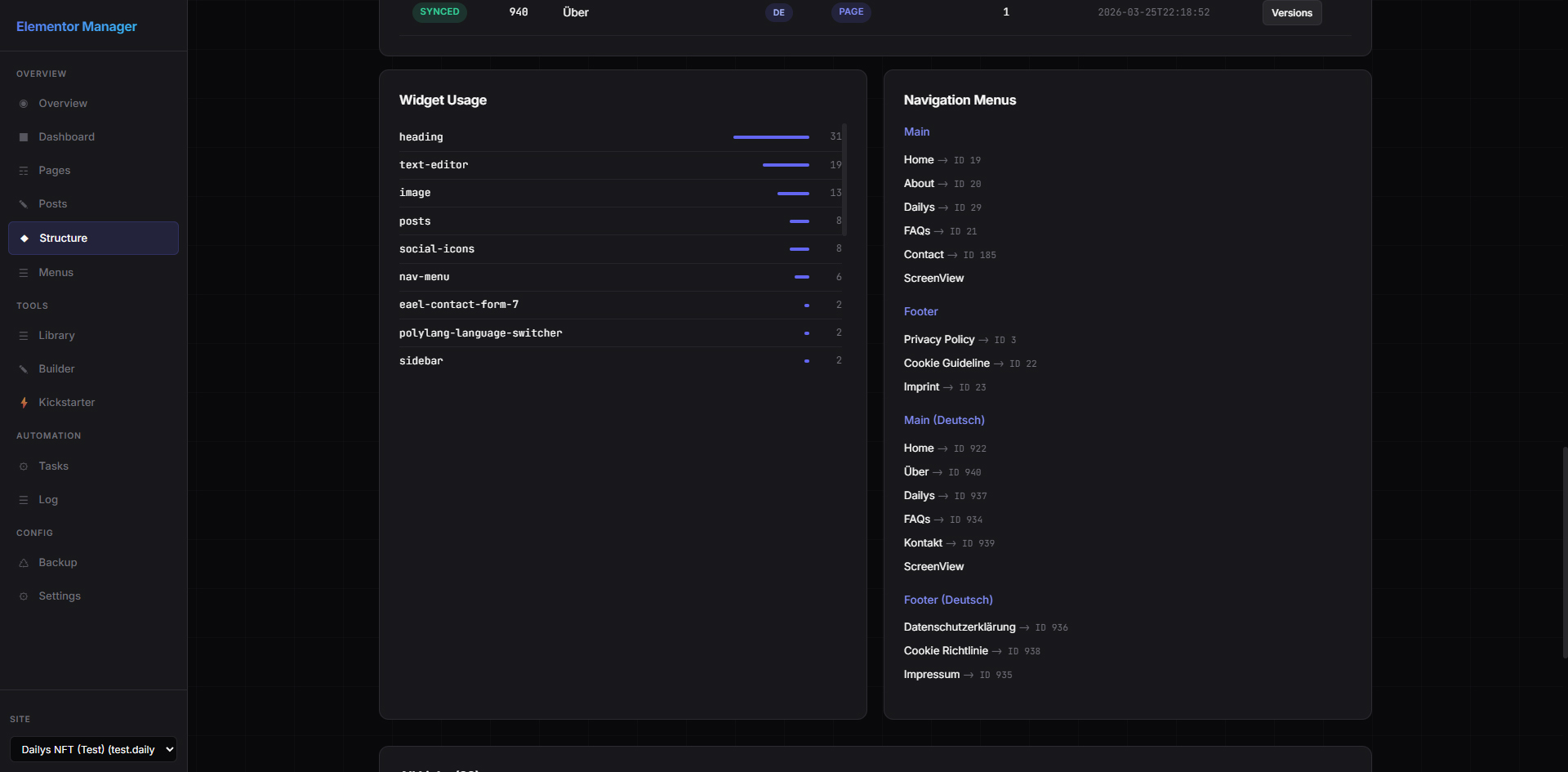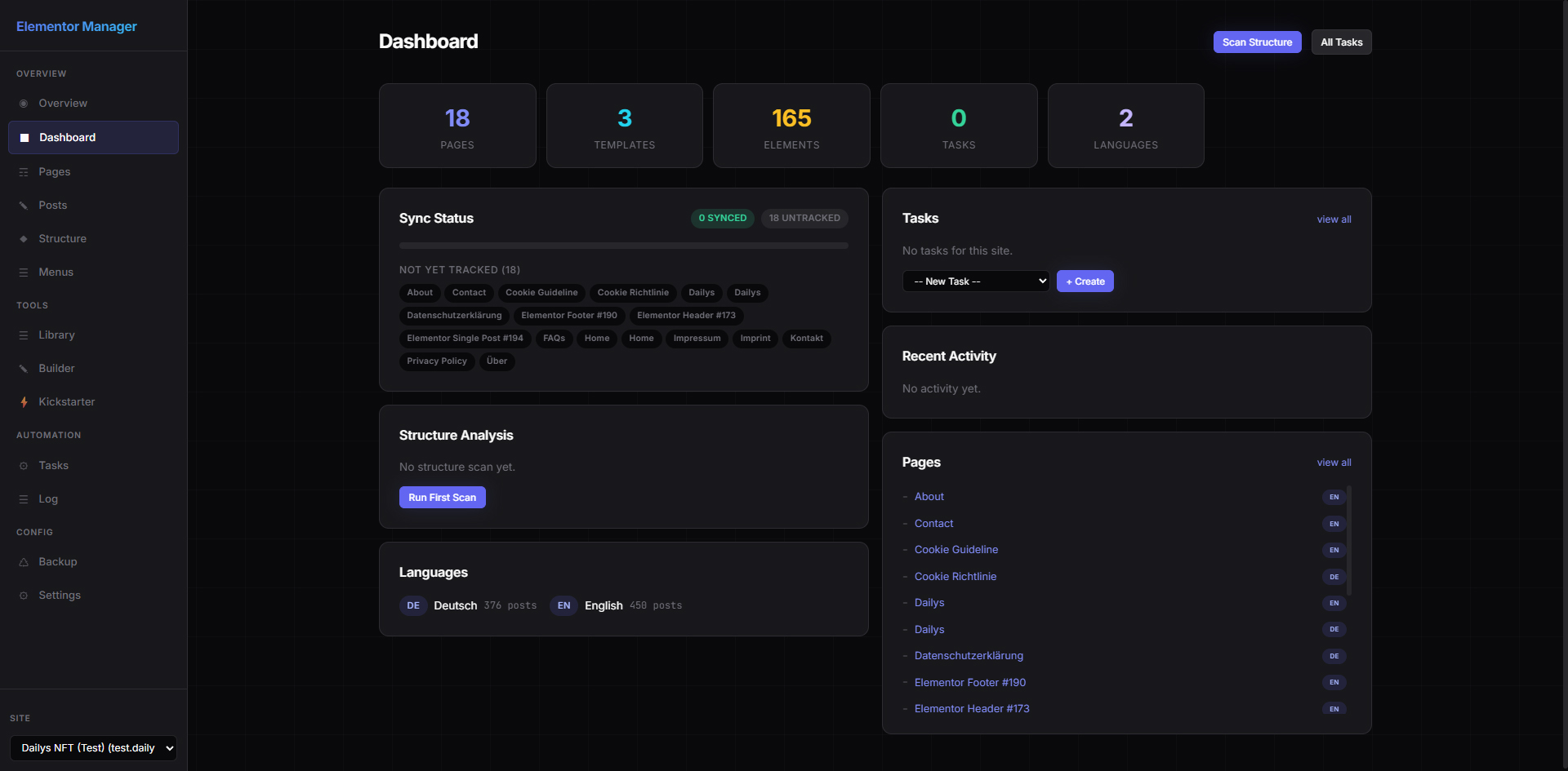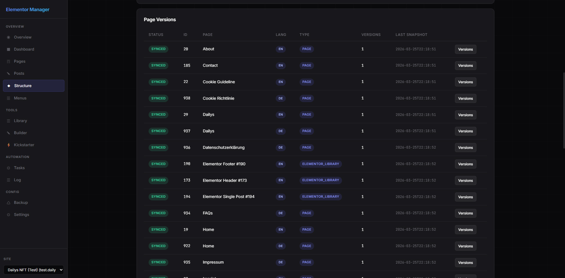 A Python web application for direct management and automation of WordPress Elementor pages via MySQL database access. Offers multi-site management, page/post/menu administration, task automation (e.g., YouTube video updates, text find & replace), backup/restore, structure analysis with interactive graph, versioning with pull/push/diff, an AI-powered page builder, plus a REST API and MCP server with 20+ tools for LLM integrations.