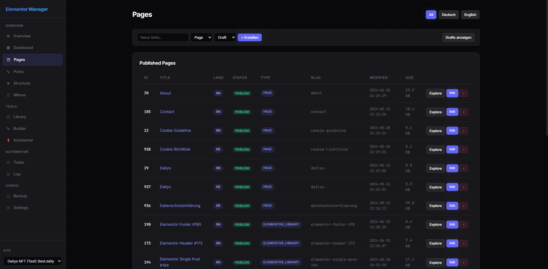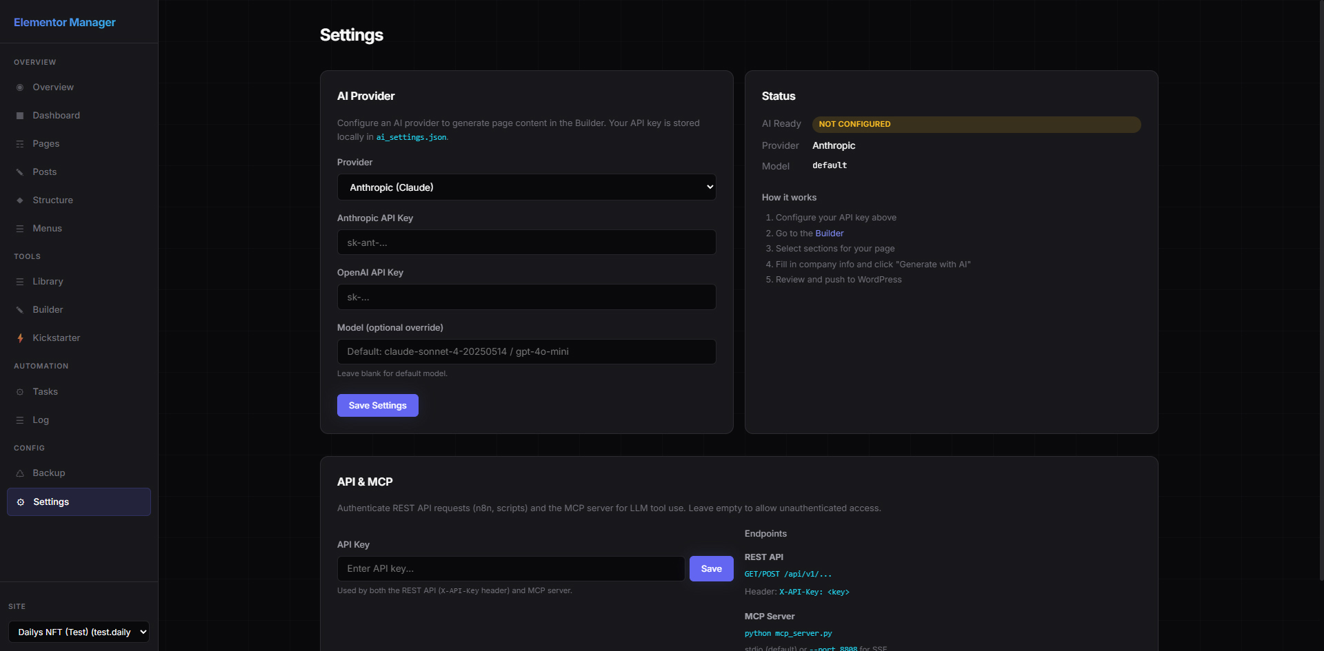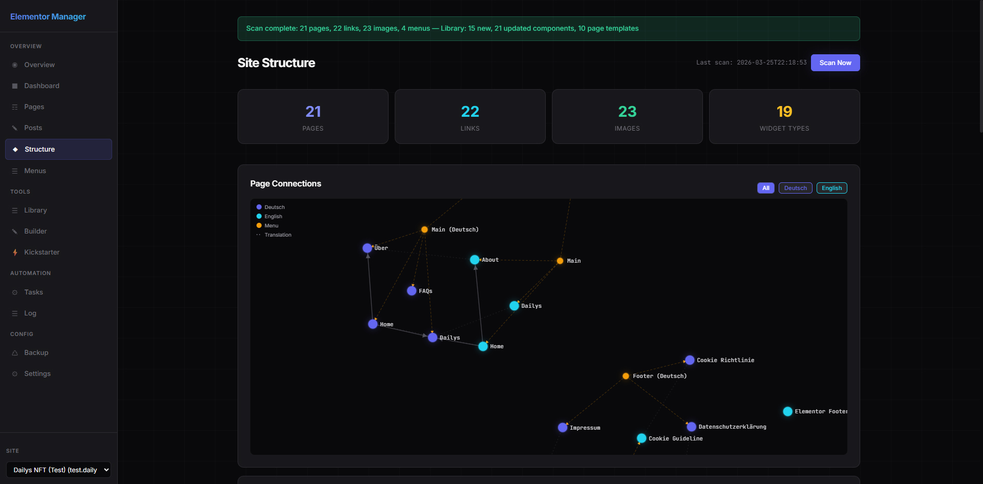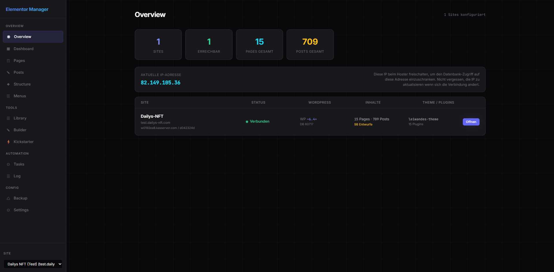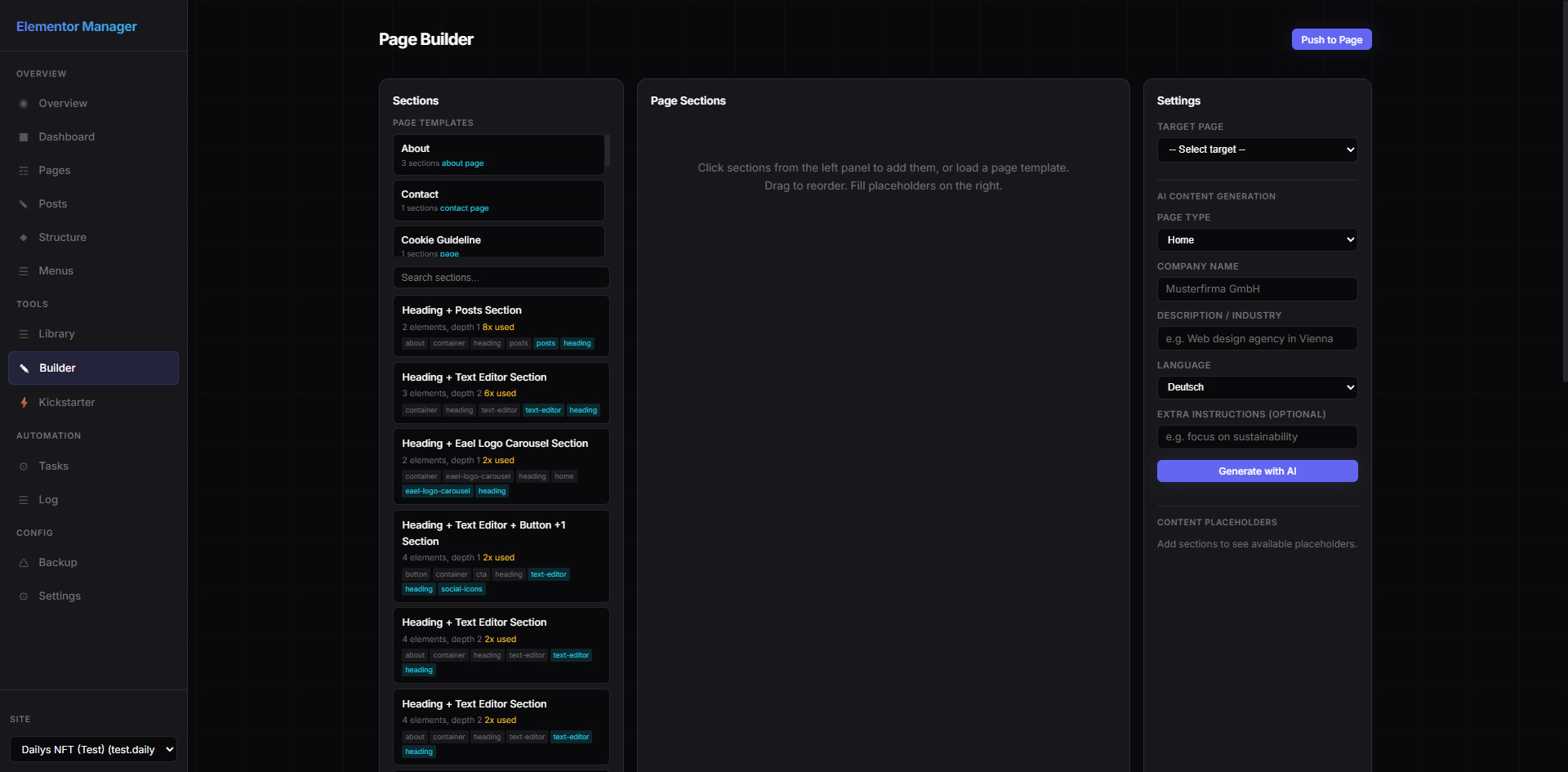 A Python web application for direct management and automation of WordPress Elementor pages via MySQL database access. Offers multi-site management, page/post/menu administration, task automation (e.g., YouTube video updates, text find & replace), backup/restore, structure analysis with interactive graph, versioning with pull/push/diff, an AI-powered page builder, plus a REST API and MCP server with 20+ tools for LLM integrations.