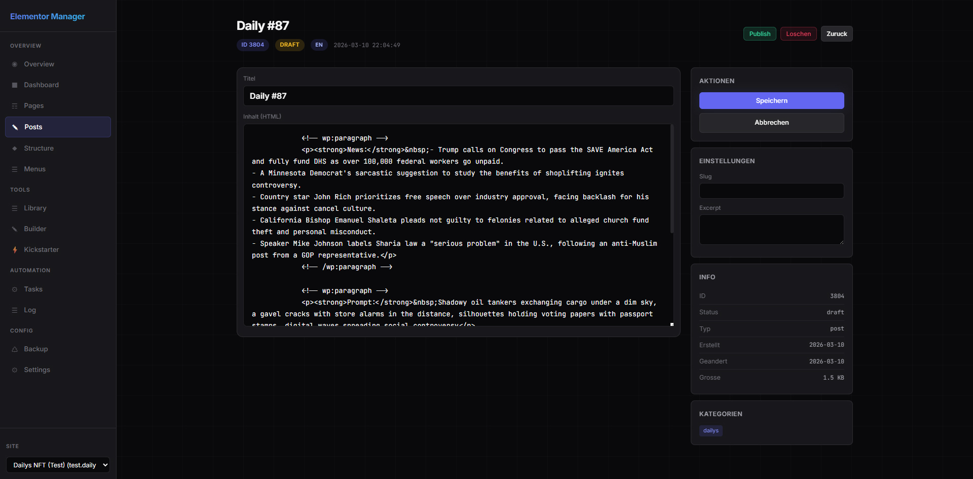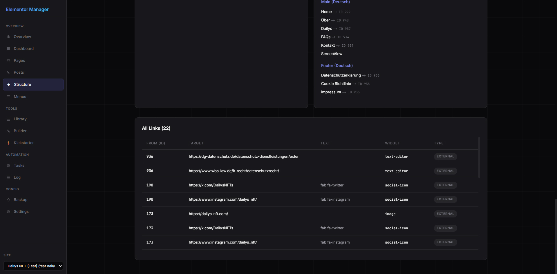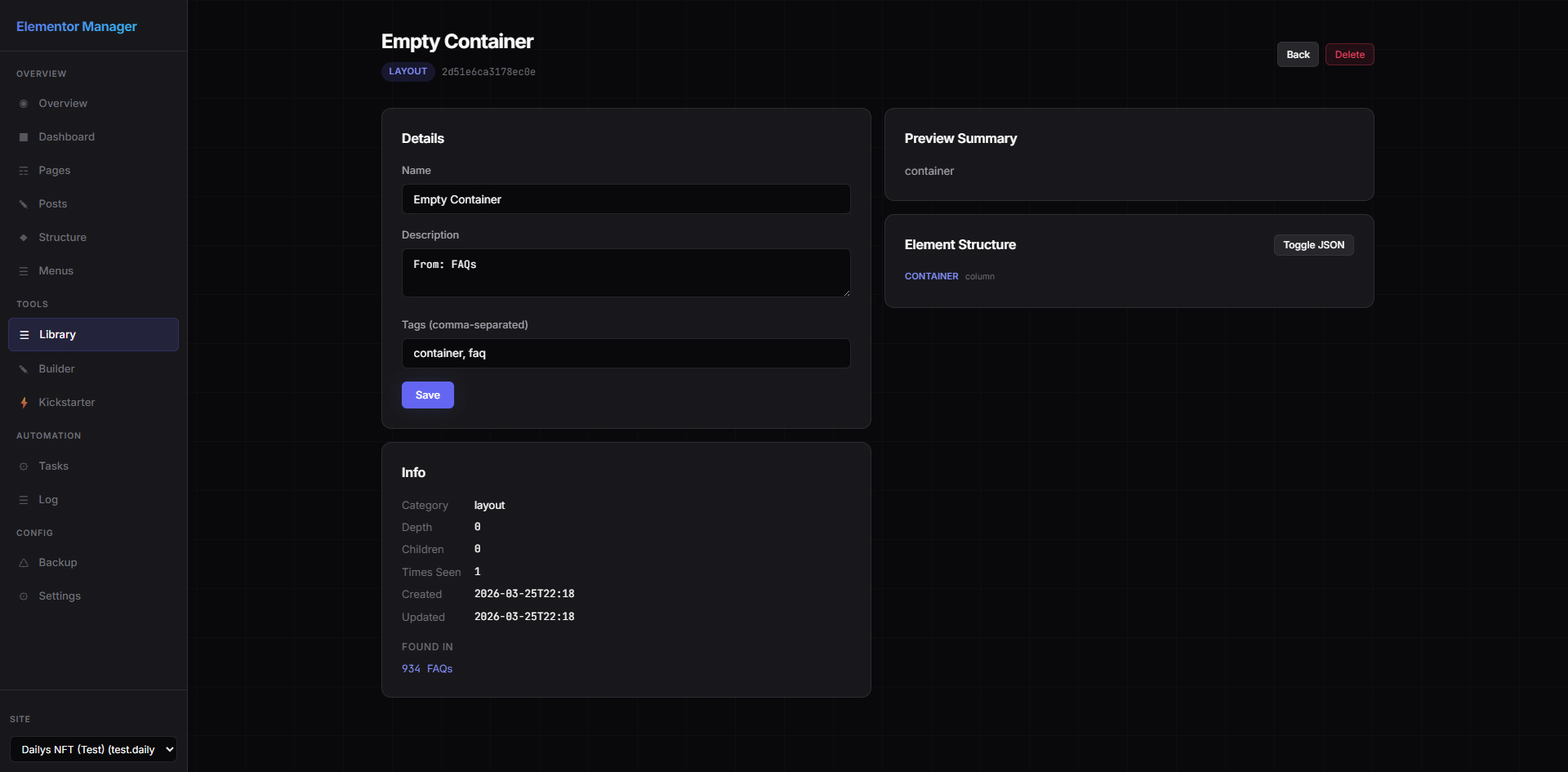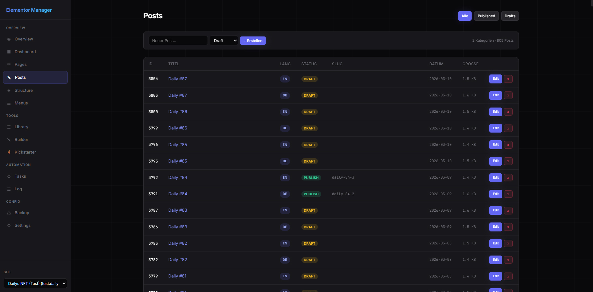 A Python web application for direct management and automation of WordPress Elementor pages via MySQL database access. Offers multi-site management, page/post/menu administration, task automation (e.g., YouTube video updates, text find & replace), backup/restore, structure analysis with interactive graph, versioning with pull/push/diff, an AI-powered page builder, plus a REST API and MCP server with 20+ tools for LLM integrations.
