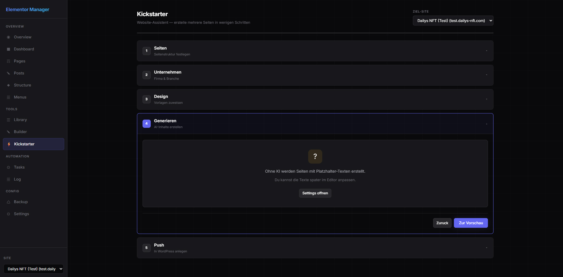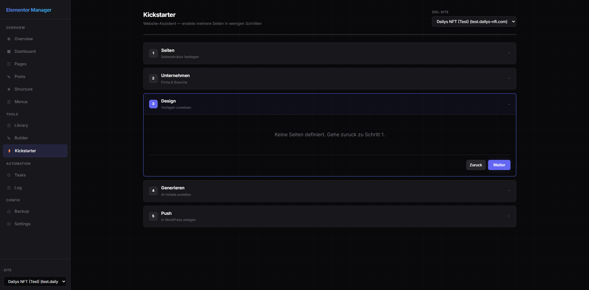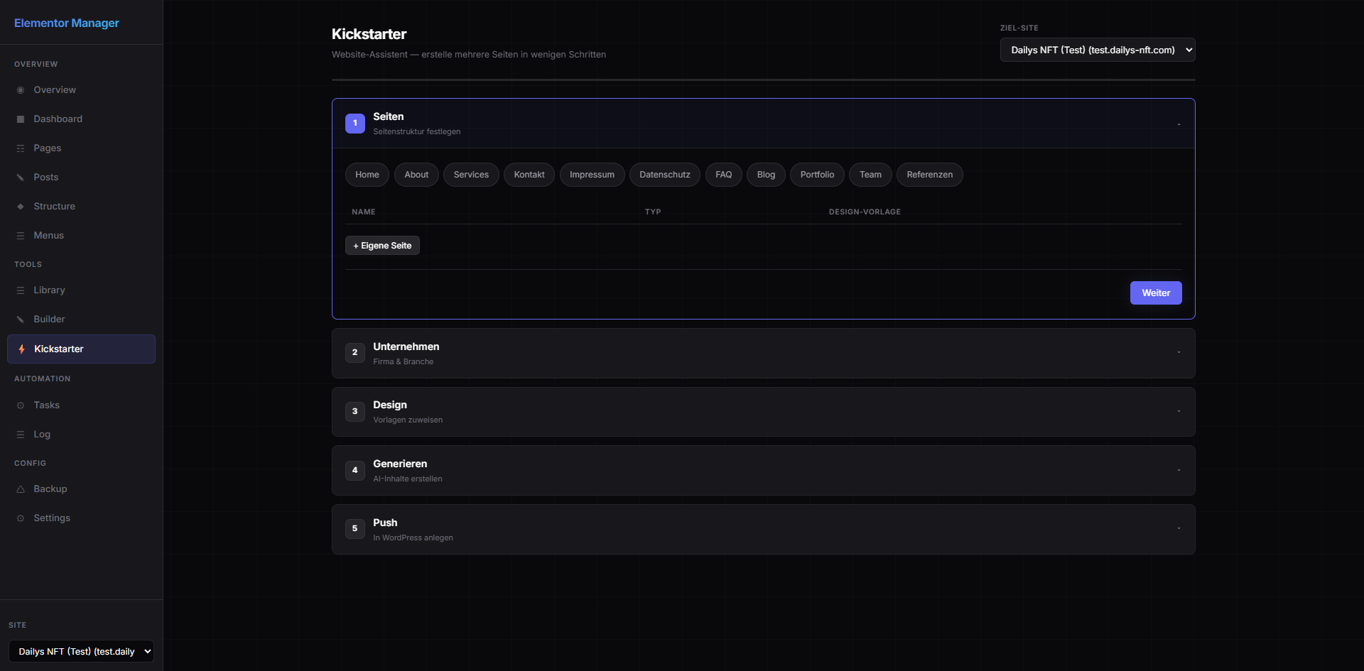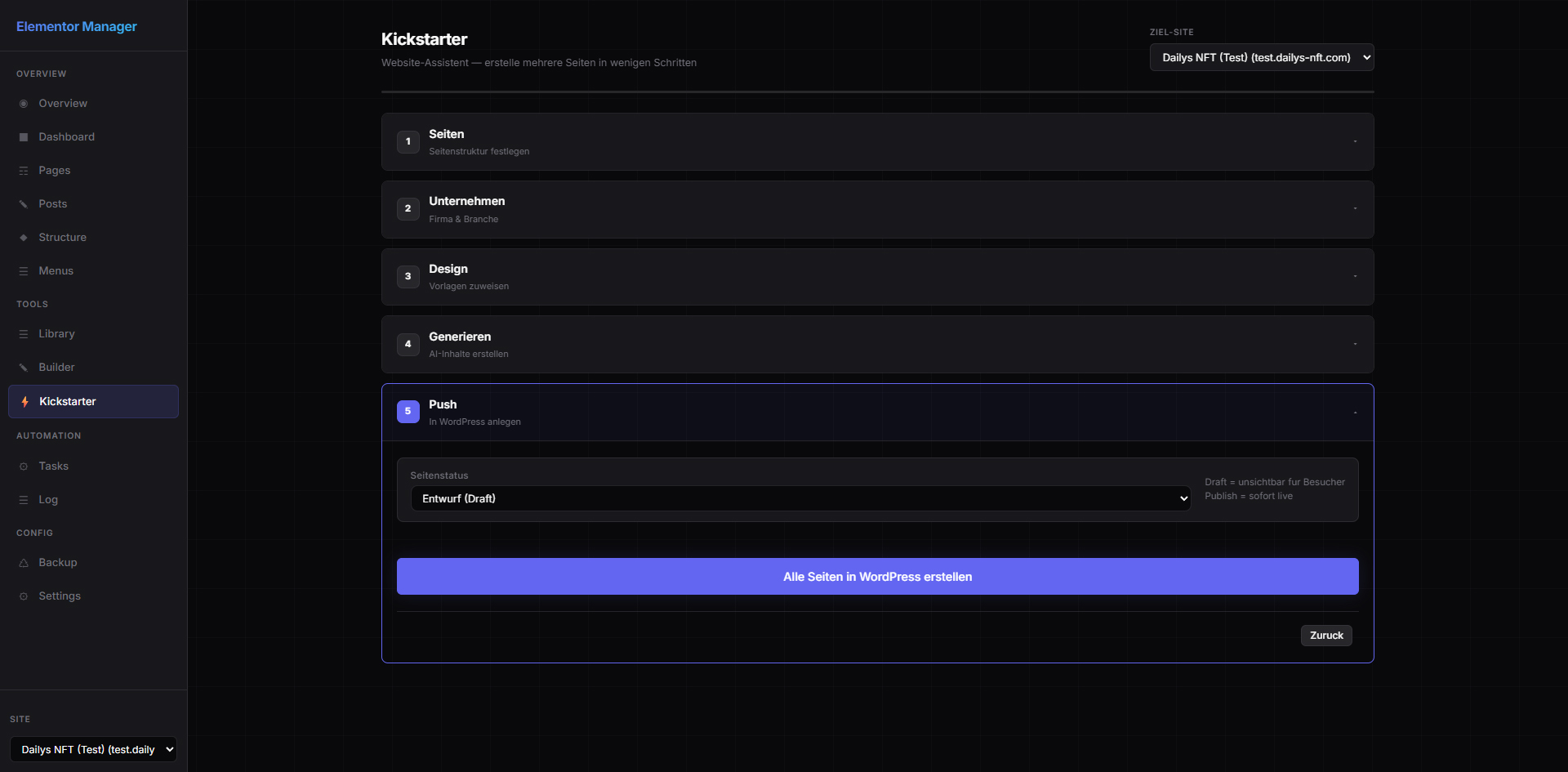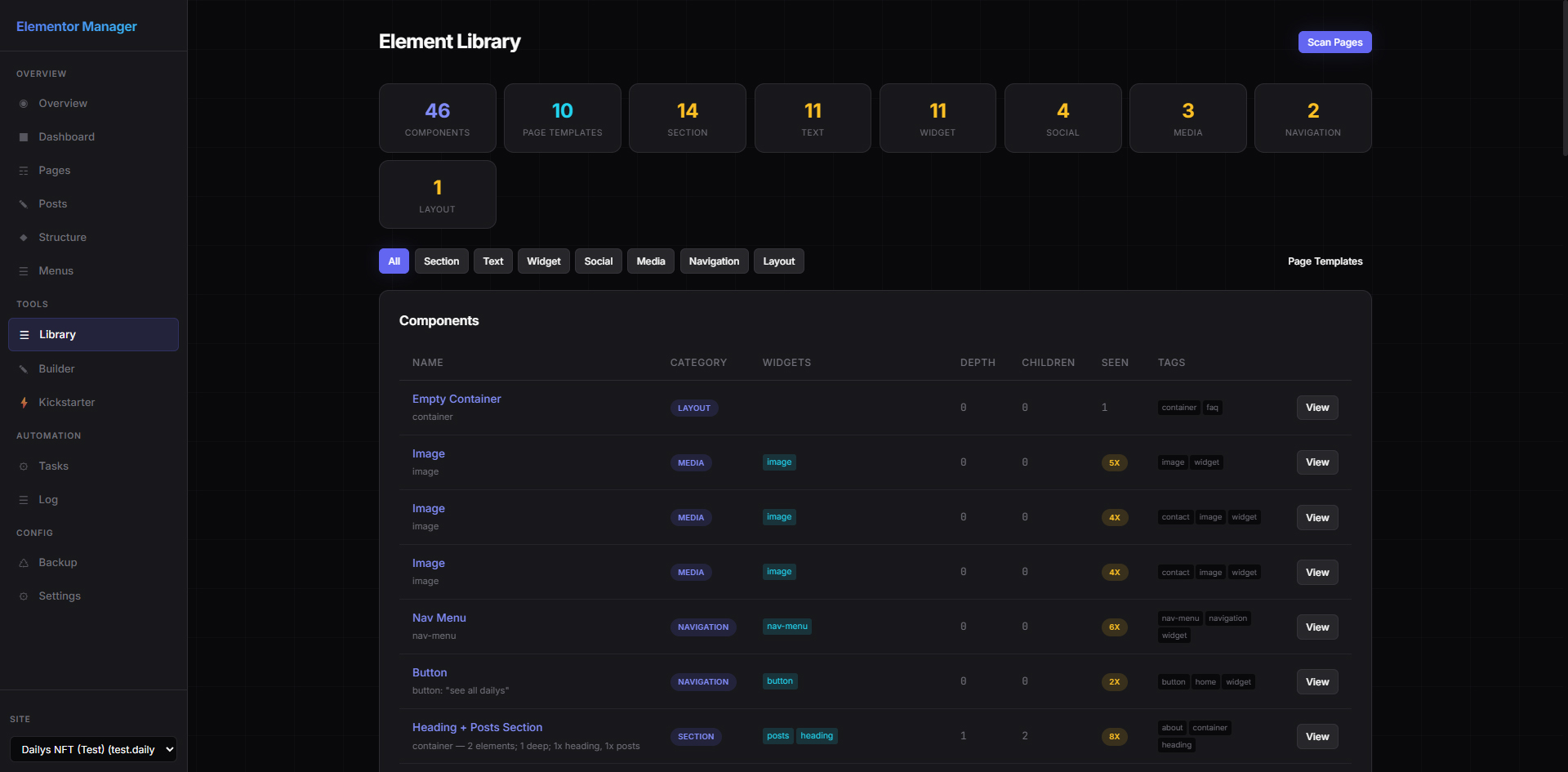 A Python web application for direct management and automation of WordPress Elementor pages via MySQL database access. Offers multi-site management, page/post/menu administration, task automation (e.g., YouTube video updates, text find & replace), backup/restore, structure analysis with interactive graph, versioning with pull/push/diff, an AI-powered page builder, plus a REST API and MCP server with 20+ tools for LLM integrations.