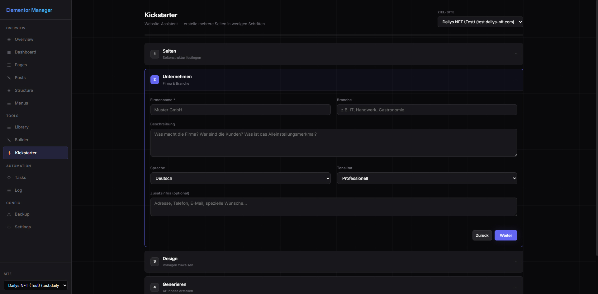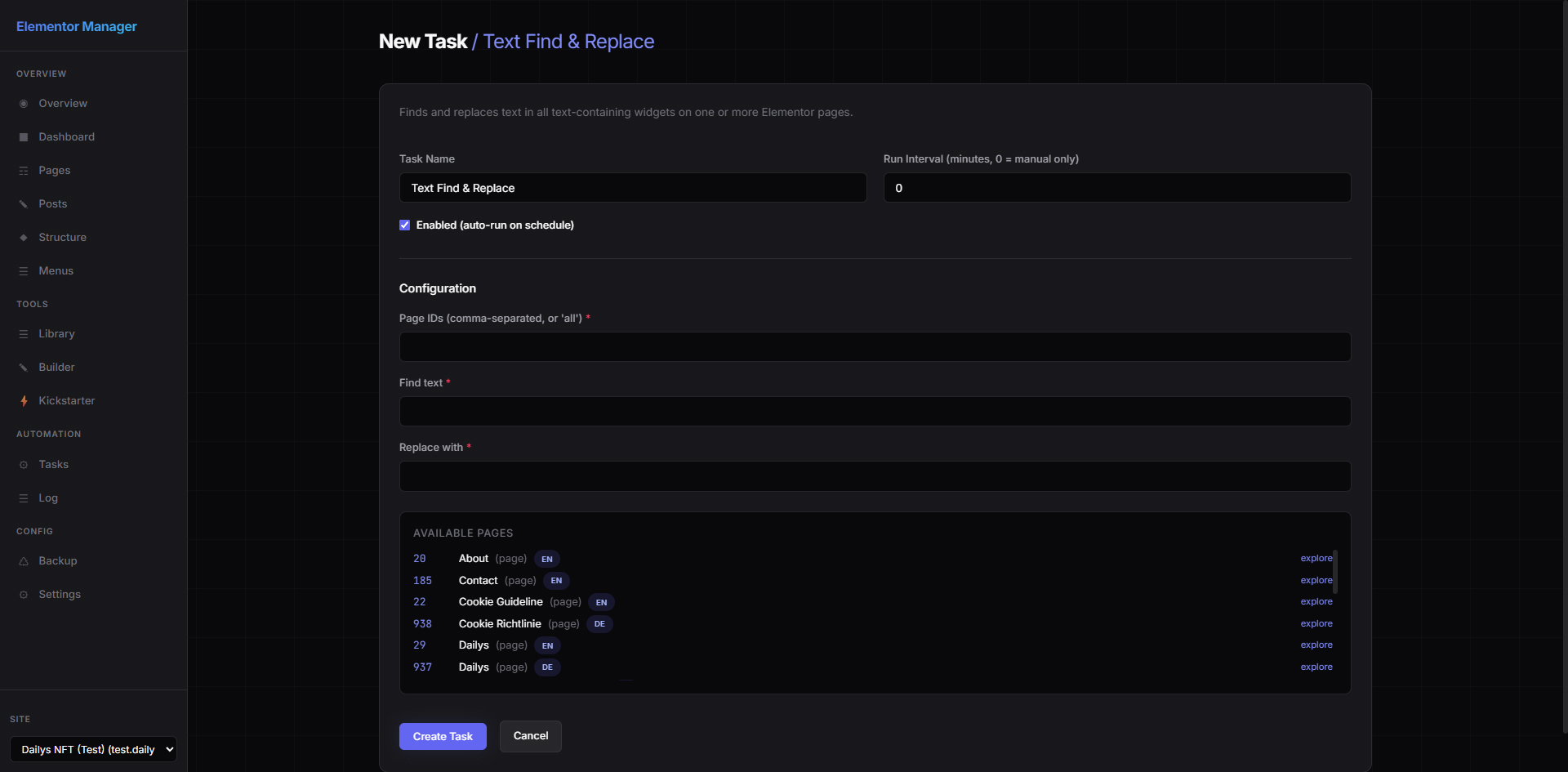 Managing multiple WordPress websites with Elementor builder requires repetitive manual work across different admin interfaces. Content changes across multiple sites (e.g., contact details, YouTube embeds, footer texts) must be performed individually. Elementor stores its data in serialized JSON structures in the database, making direct manipulation without specialized tools practically impossible.