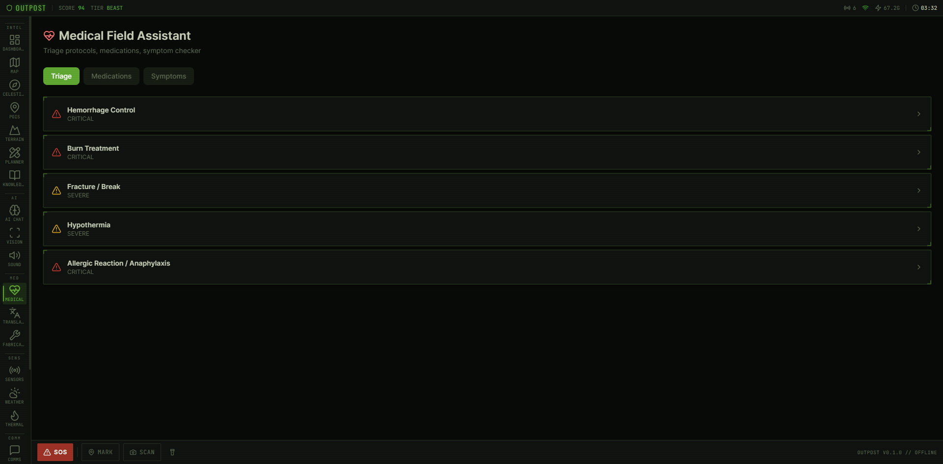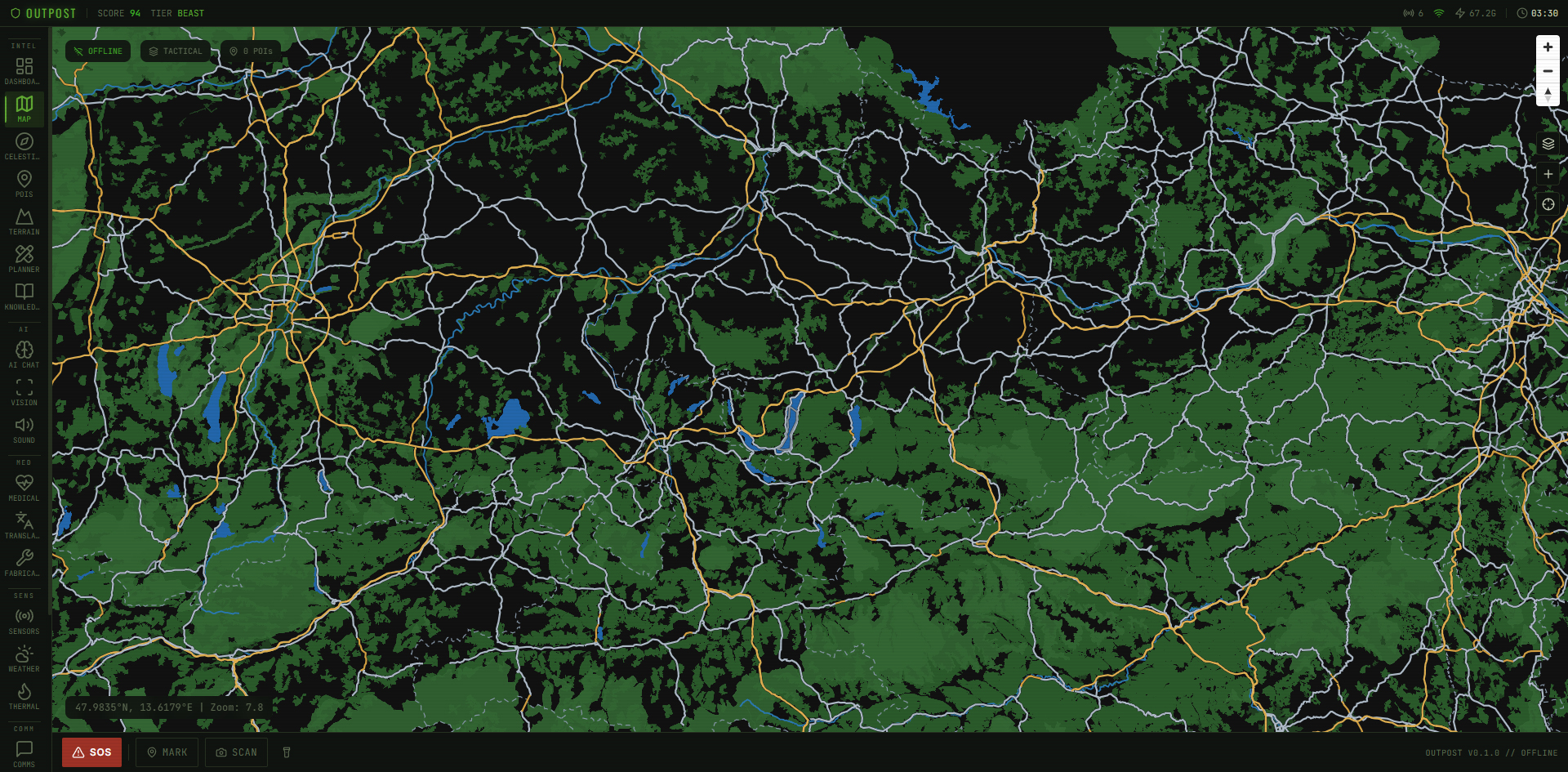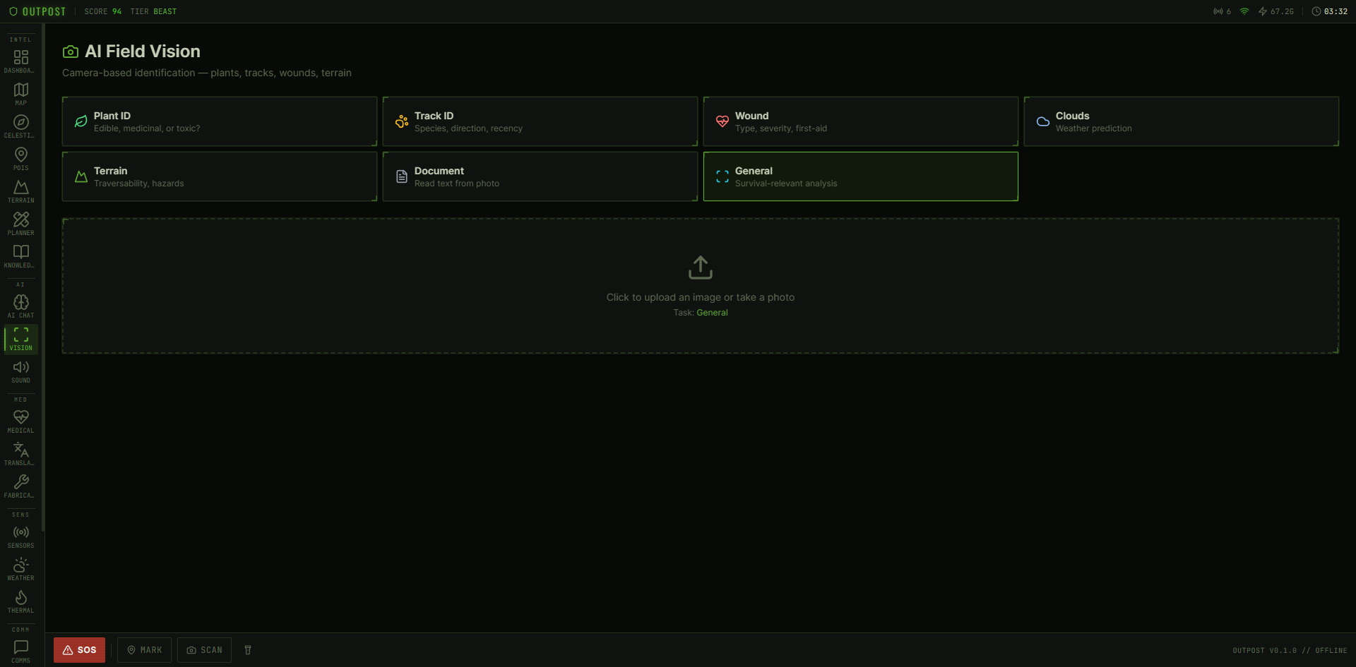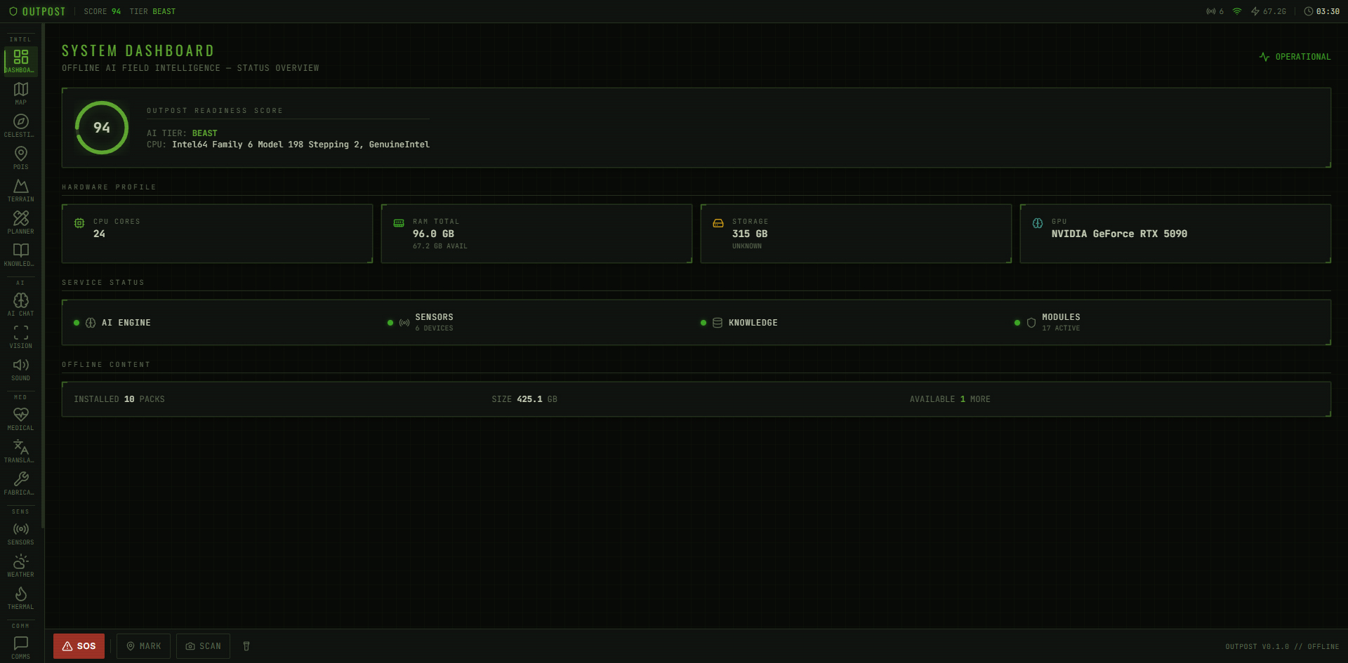 An offline-capable field intelligence platform providing AI-powered decision support even without internet connectivity. Comprises 16 modules: local AI assistant (Ollama), offline maps with preloaded satellite data, medical reference database, survival knowledge base, GPS navigation without network, weather forecasting from local sensor data, communication via mesh networks, drone reconnaissance, counter-surveillance, CBRN reference, encrypted logbook, and resource management. Progressive web app for cross-platform deployment on laptop, tablet, and smartphone.