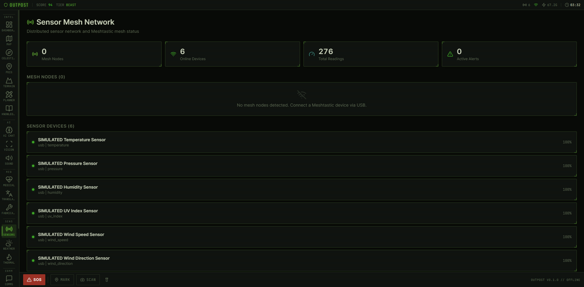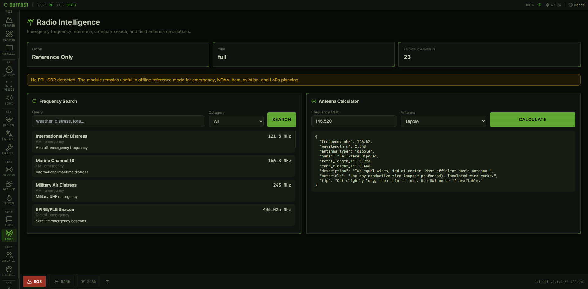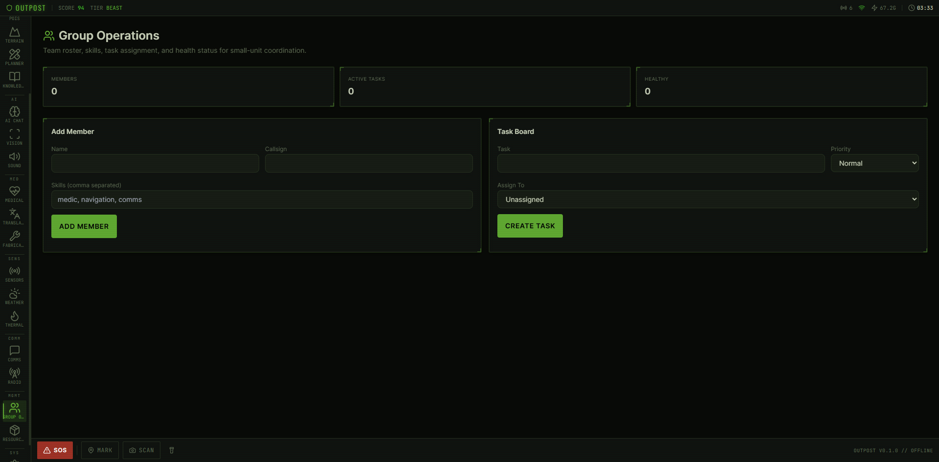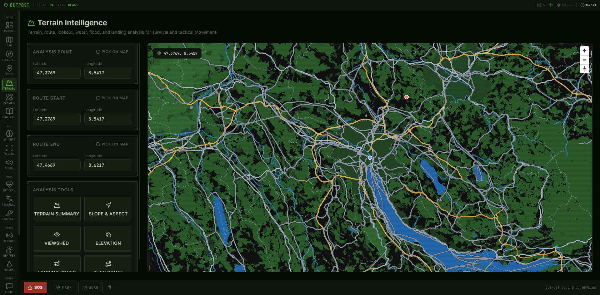 An offline-capable field intelligence platform providing AI-powered decision support even without internet connectivity. Comprises 16 modules: local AI assistant (Ollama), offline maps with preloaded satellite data, medical reference database, survival knowledge base, GPS navigation without network, weather forecasting from local sensor data, communication via mesh networks, drone reconnaissance, counter-surveillance, CBRN reference, encrypted logbook, and resource management. Progressive web app for cross-platform deployment on laptop, tablet, and smartphone.