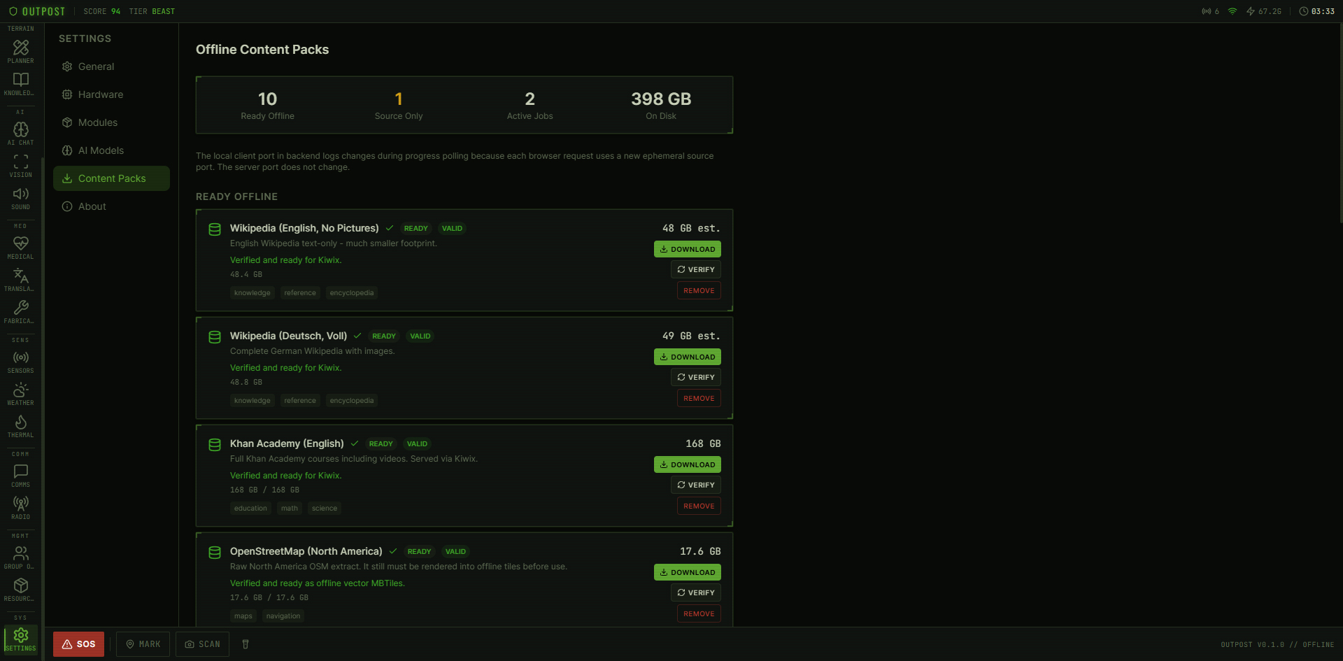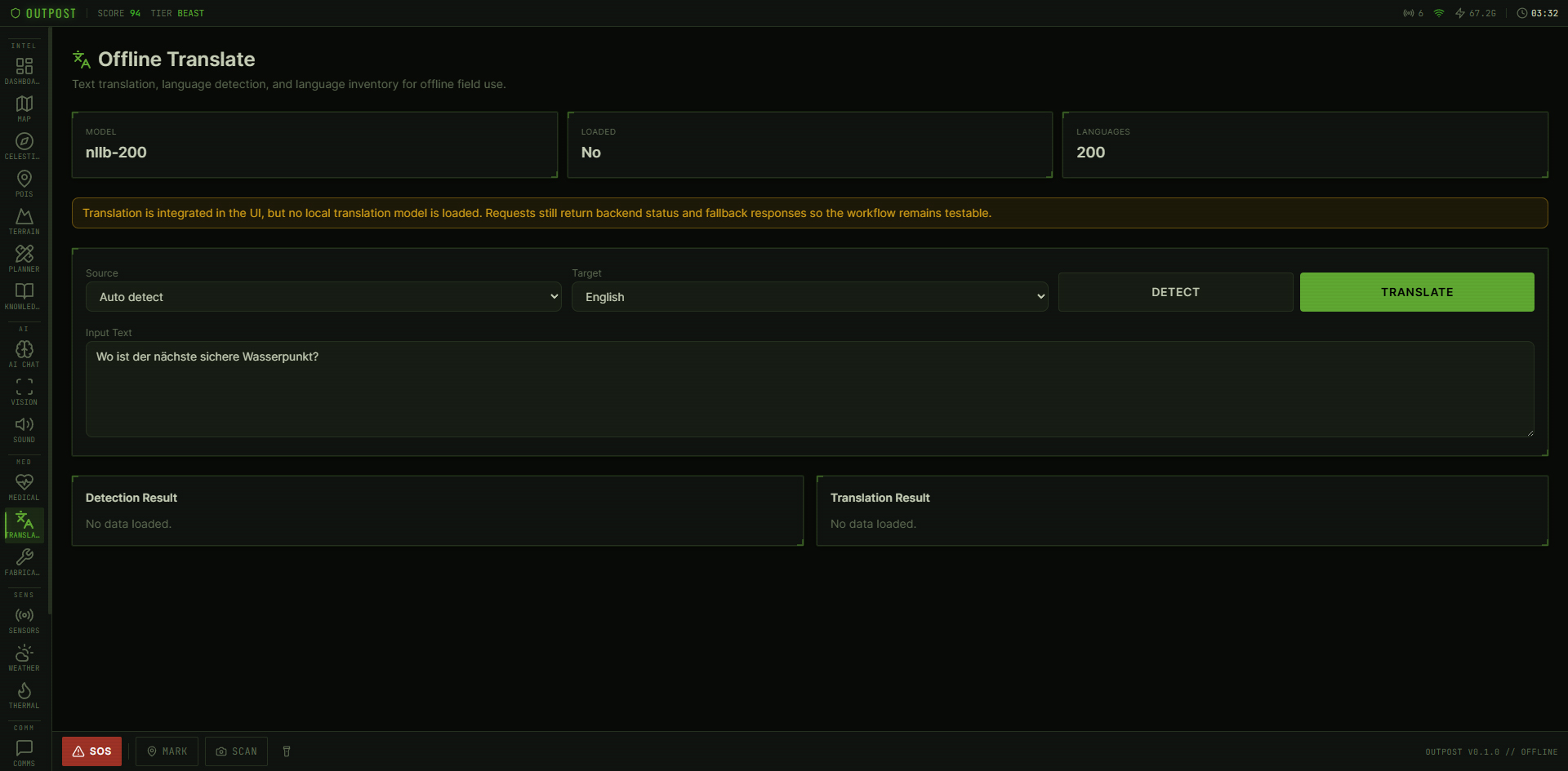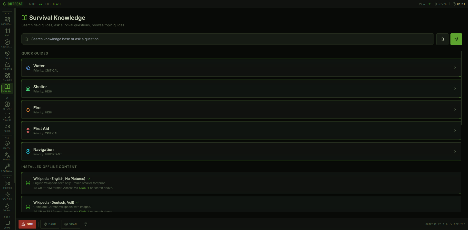 In crisis, disaster, and field deployment scenarios, internet connectivity is frequently unavailable. Existing AI assistants, map services, and knowledge databases are entirely cloud-dependent and therefore useless in offline operation. An integrated, offline-capable platform combining AI support, map material, medical knowledge, survival techniques, and tactical information on a single device — without network dependency — is missing.