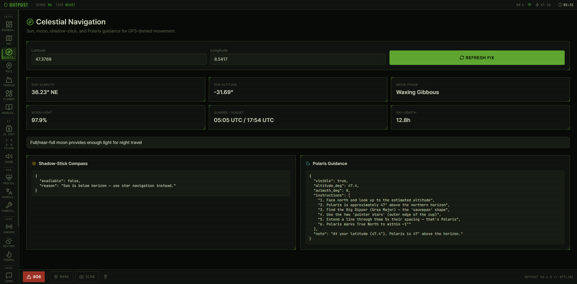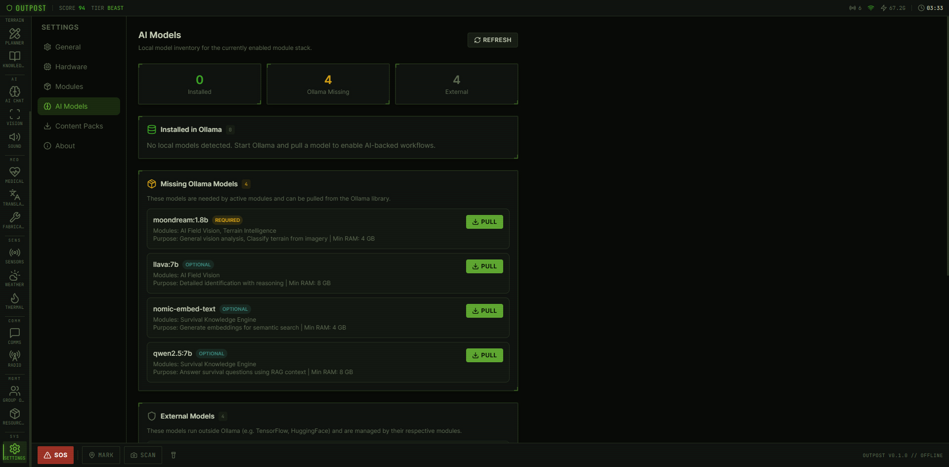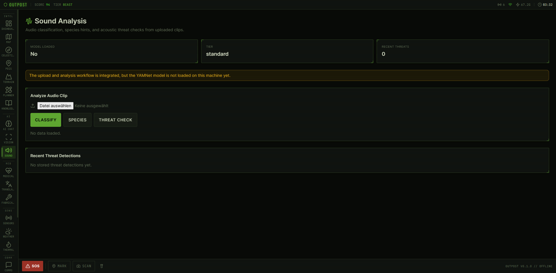 In crisis, disaster, and field deployment scenarios, internet connectivity is frequently unavailable. Existing AI assistants, map services, and knowledge databases are entirely cloud-dependent and therefore useless in offline operation. An integrated, offline-capable platform combining AI support, map material, medical knowledge, survival techniques, and tactical information on a single device — without network dependency — is missing.