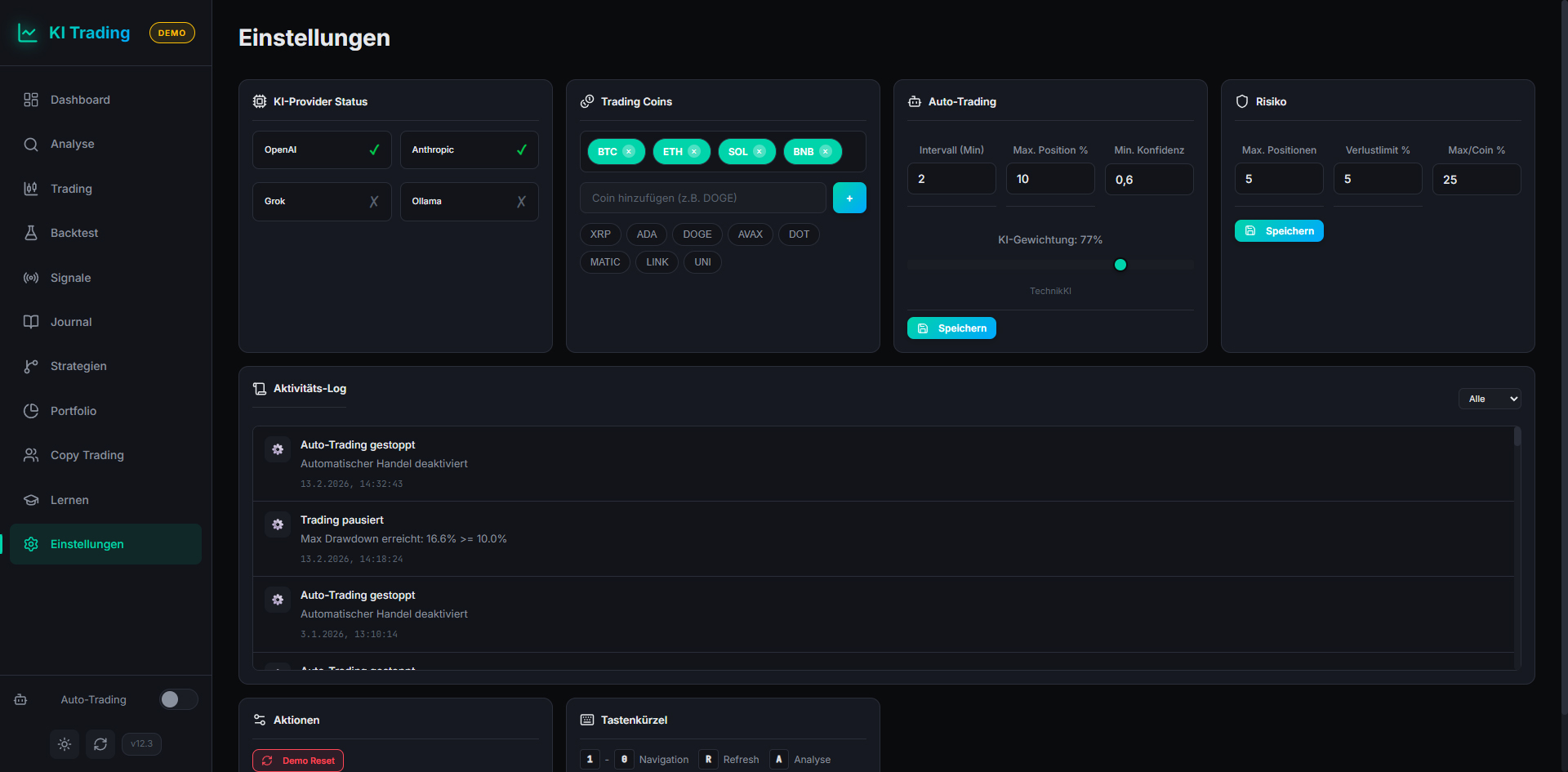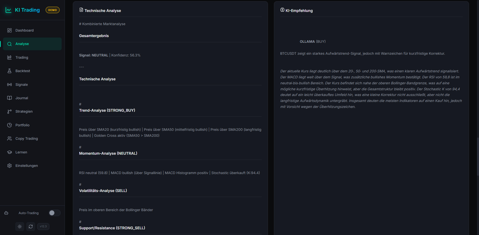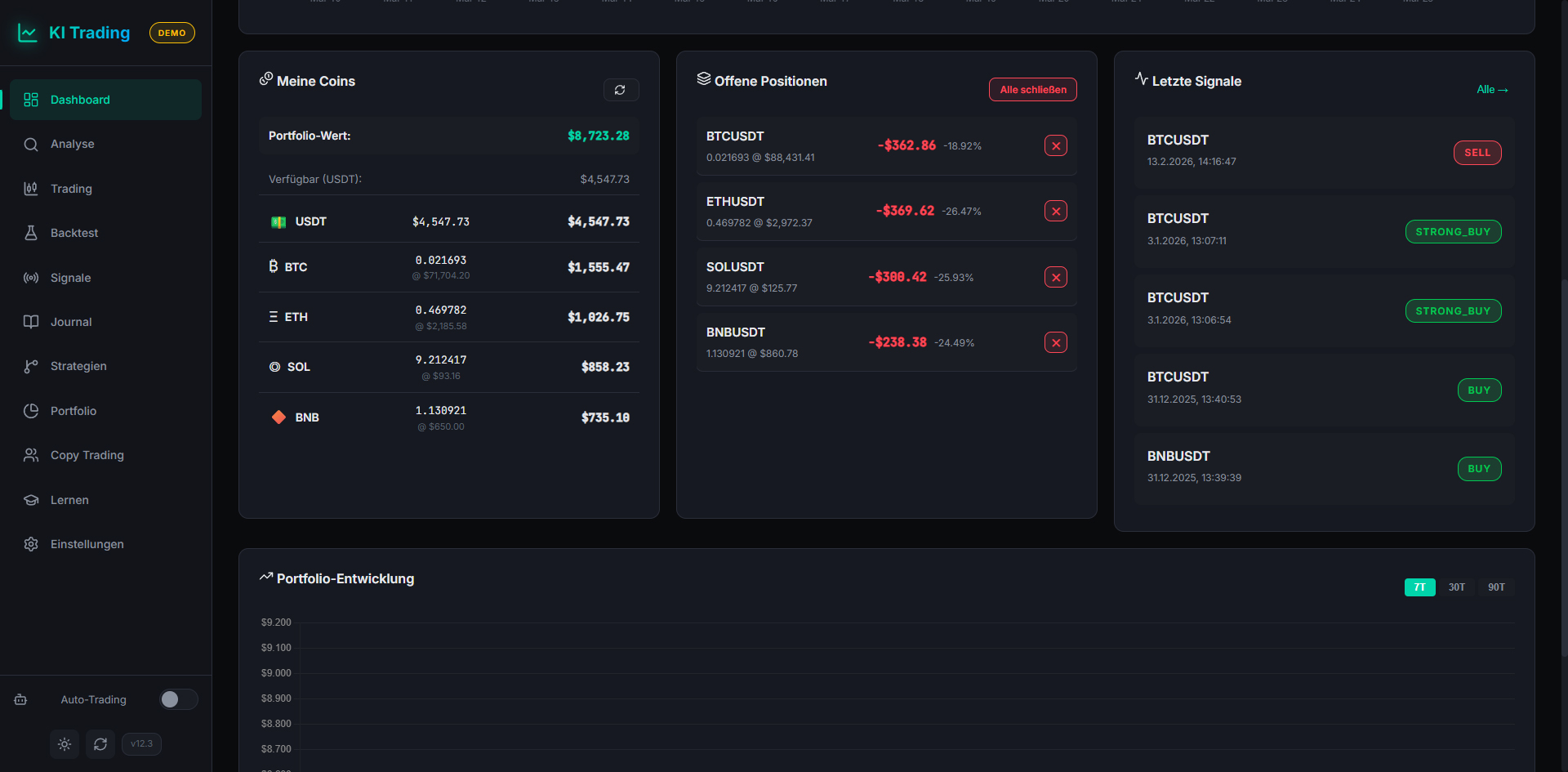 A modular trading application with Binance API integration for AI-powered market analysis and automated trading. Offers trailing stop-loss, OCO orders, dollar-cost averaging (DCA), price alerts, backtesting, technical indicators, and real-time Telegram notifications. Supports cloud AI (OpenAI/Claude) and local models via Ollama. Persistent SQLite database for trades, positions, and portfolio history.