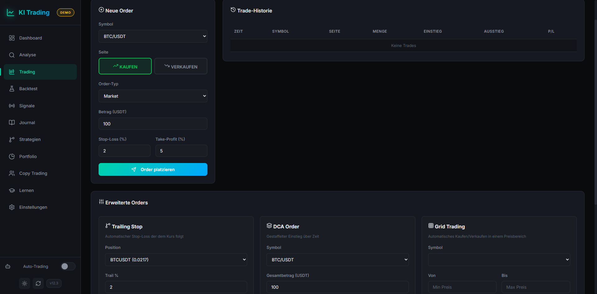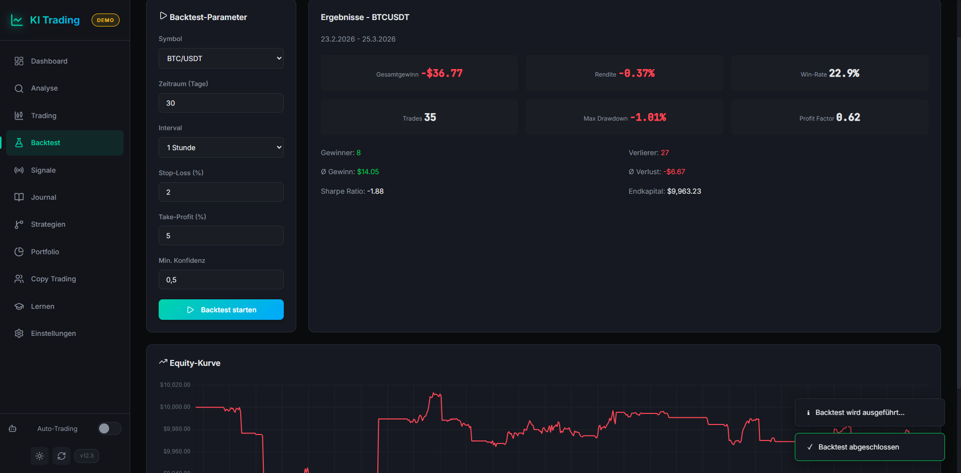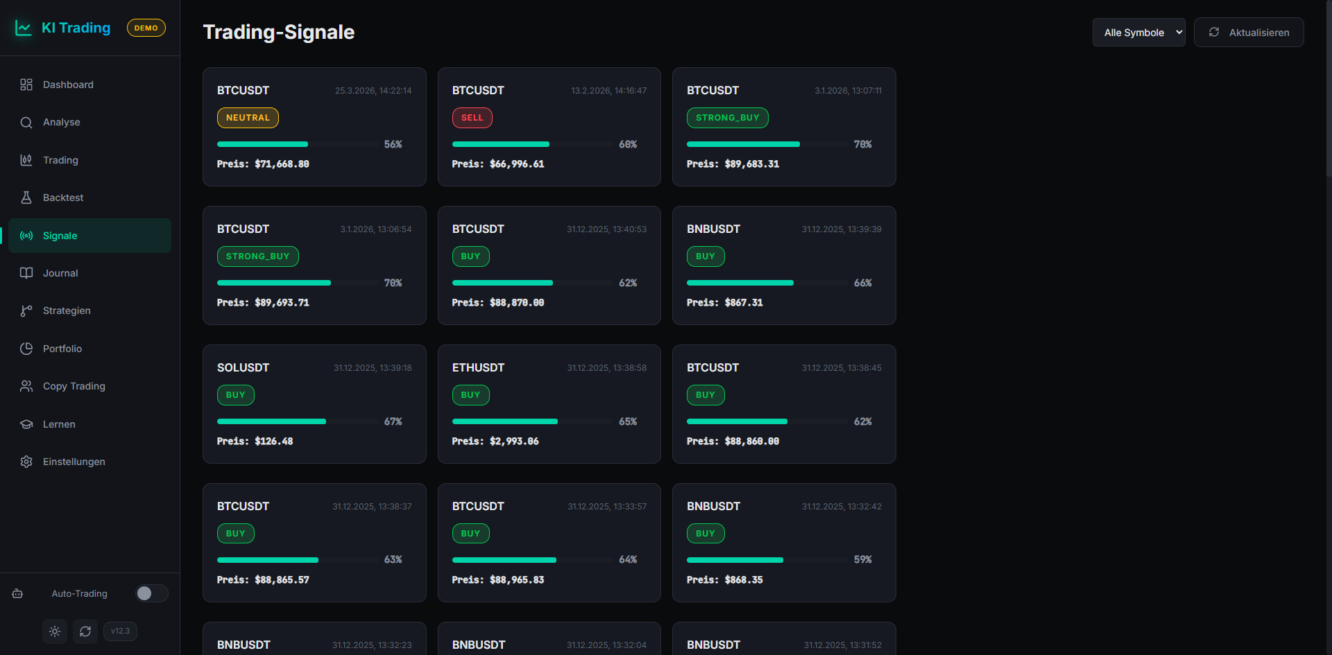 A modular trading application with Binance API integration for AI-powered market analysis and automated trading. Offers trailing stop-loss, OCO orders, dollar-cost averaging (DCA), price alerts, backtesting, technical indicators, and real-time Telegram notifications. Supports cloud AI (OpenAI/Claude) and local models via Ollama. Persistent SQLite database for trades, positions, and portfolio history.