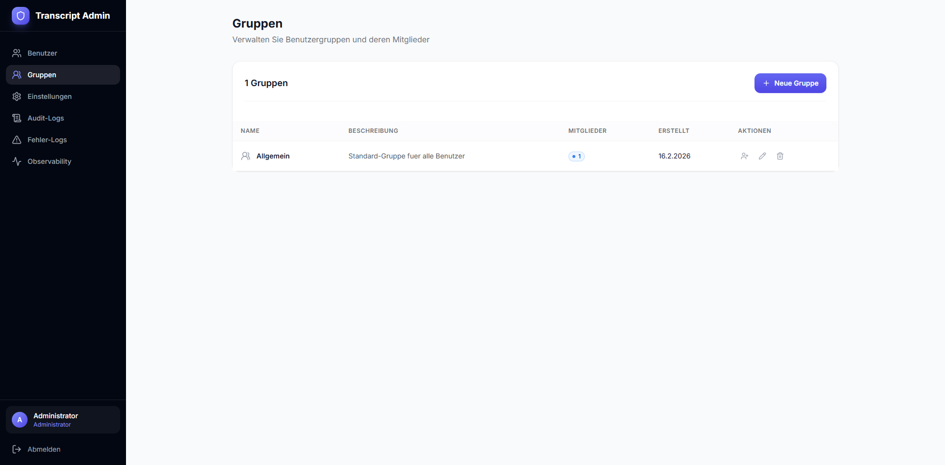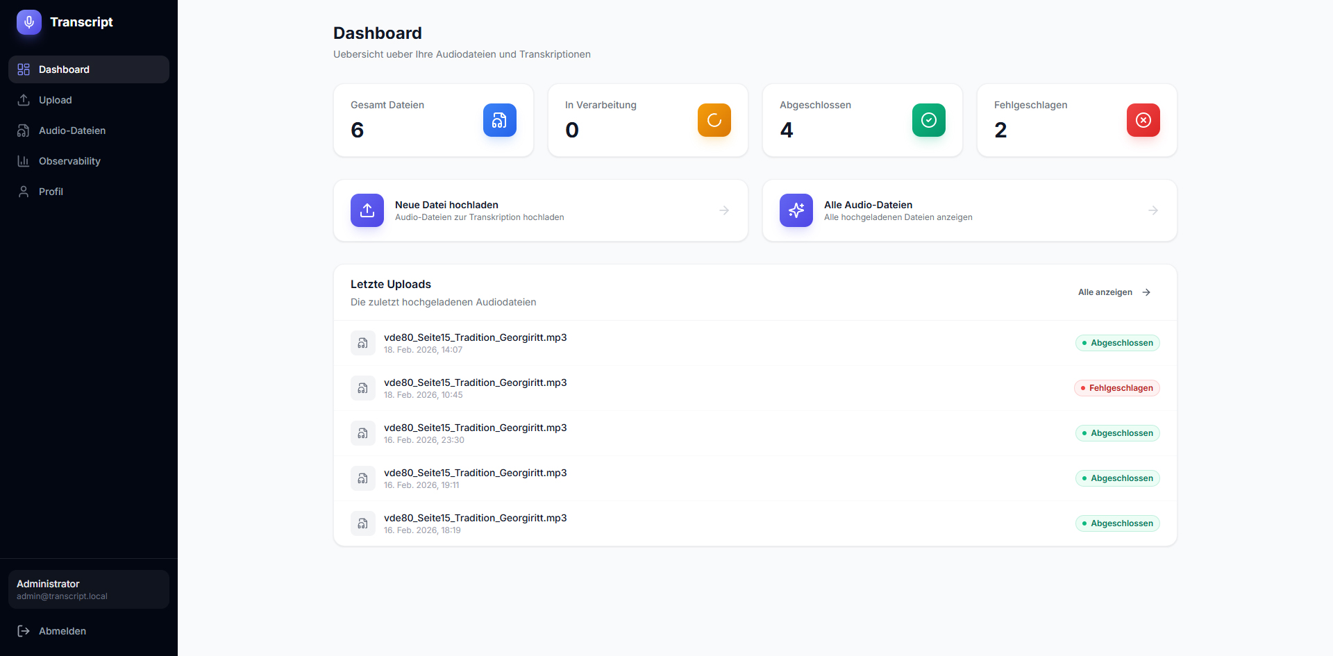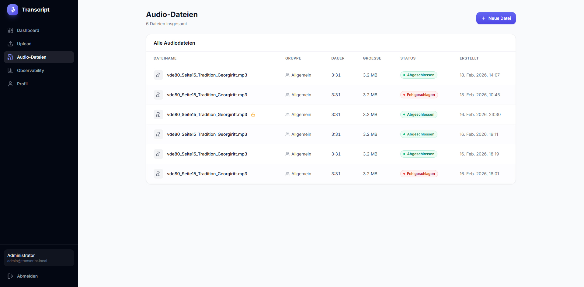 Transcription of meetings, interviews, and conferences requires not only speech-to-text but also speaker recognition (who said what?). Cloud-based services are expensive and problematic from a data privacy perspective (GDPR). Local alternatives rarely offer comparable quality, no provider comparison, and no admin dashboard for monitoring quality and performance of different Whisper variants.