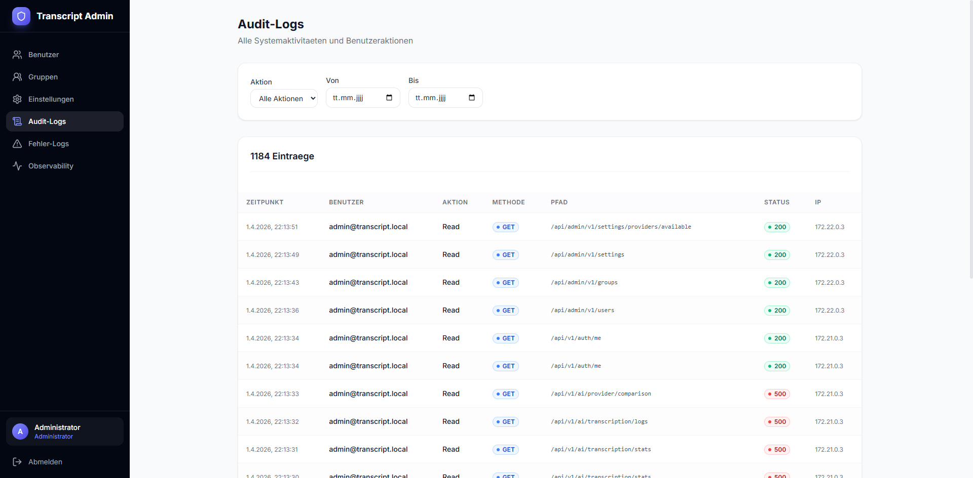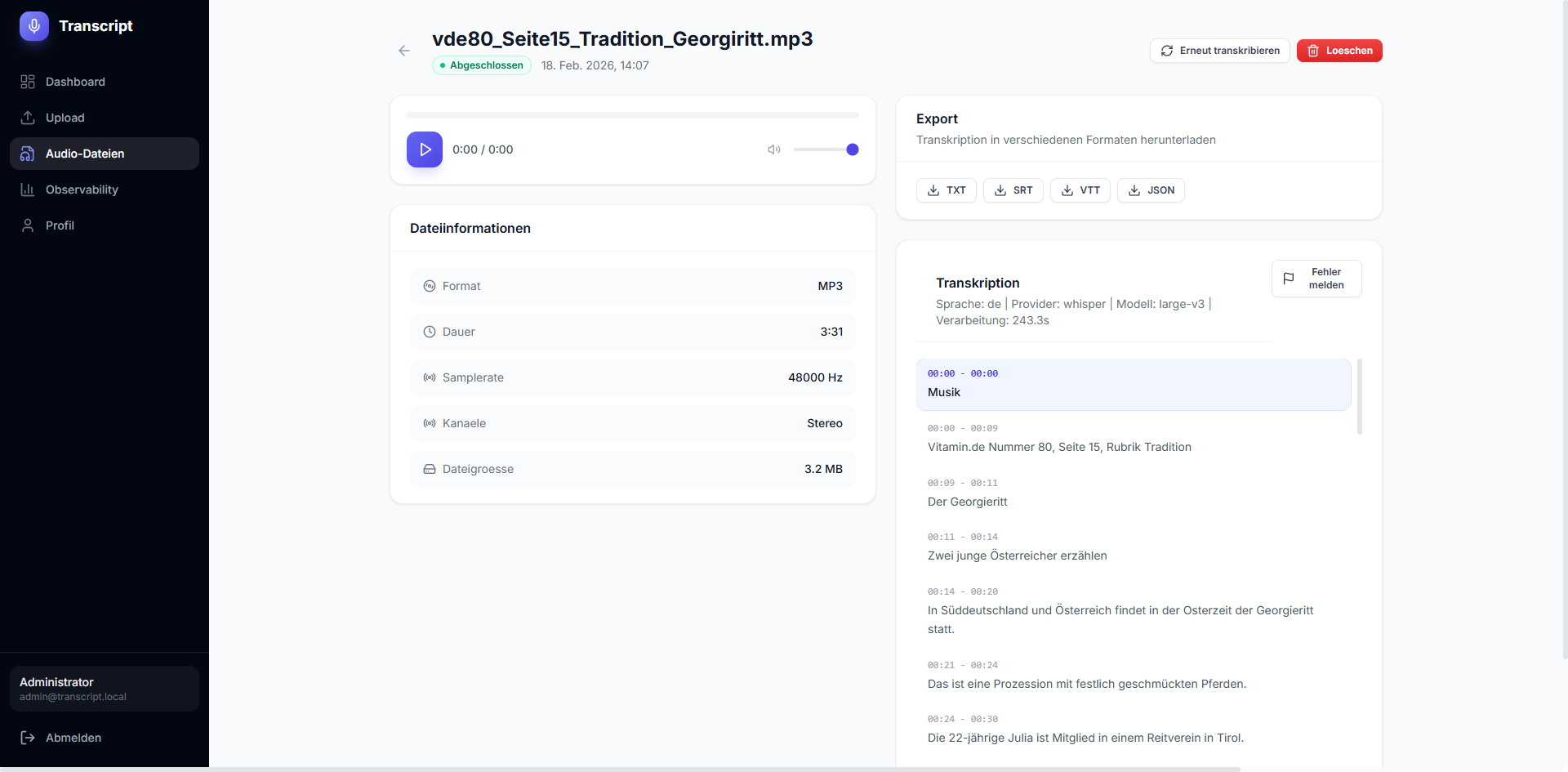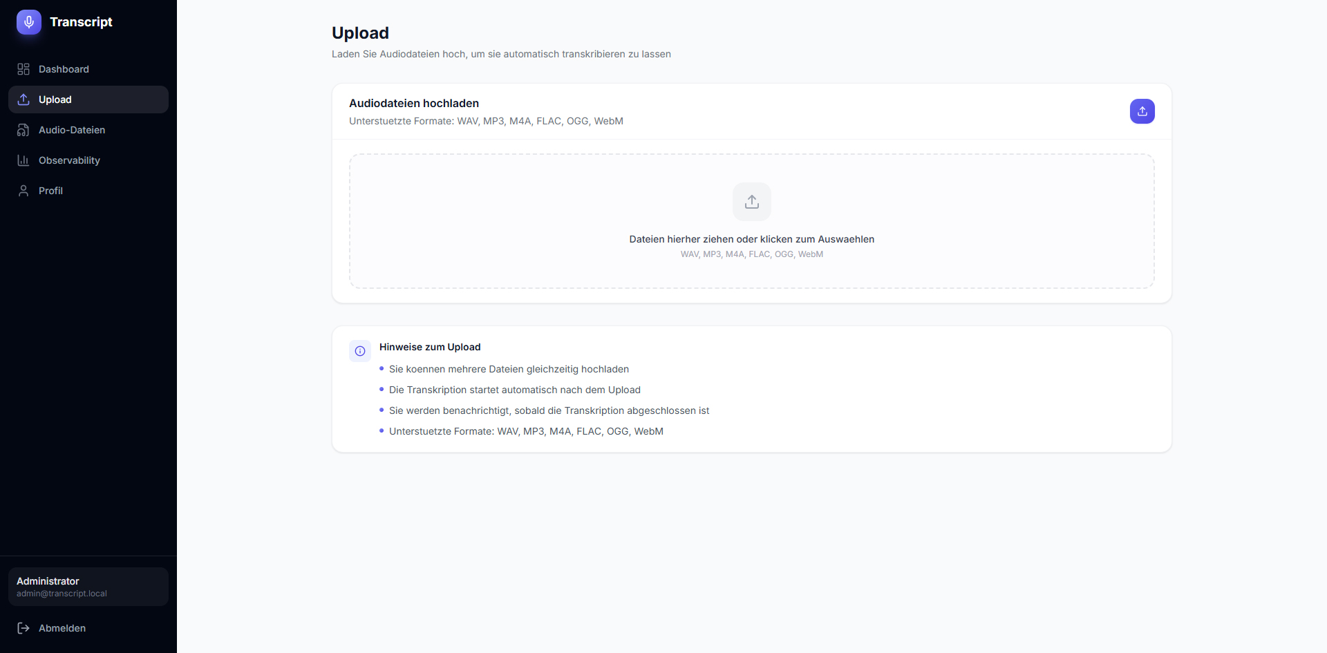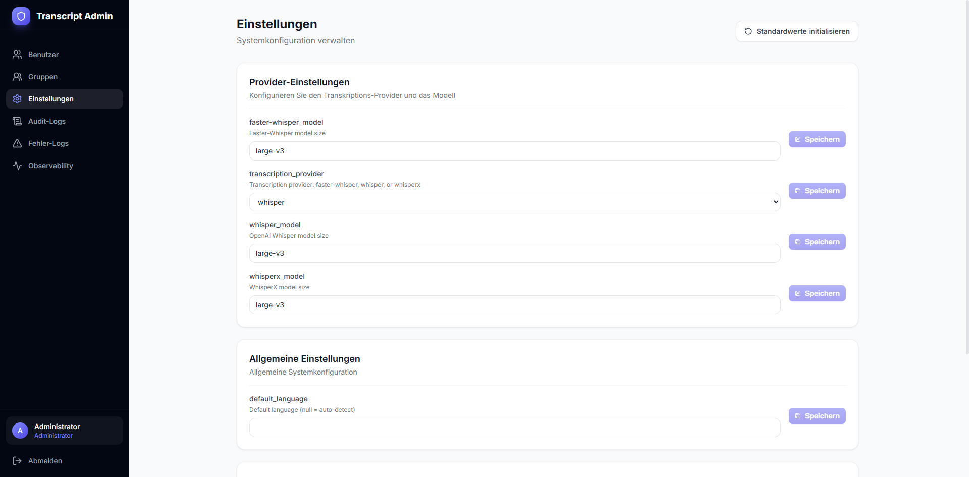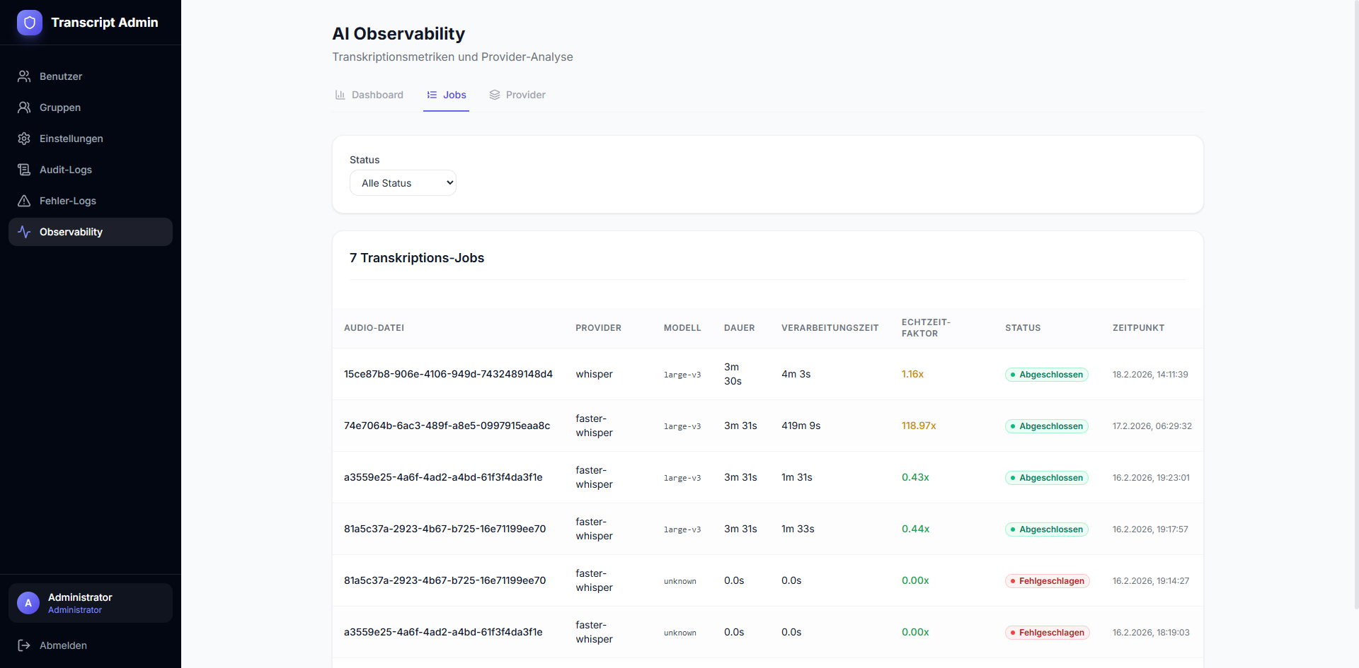 A complete transcription platform with three Whisper variants (faster-whisper, OpenAI-Whisper, WhisperX), automatic GPU acceleration (CUDA), optional speaker diarization, and provider selection per upload. Offers a user frontend and admin dashboard with observability (provider comparison, job logs, error rates, charts), user/group management, audit logs, and export functions.